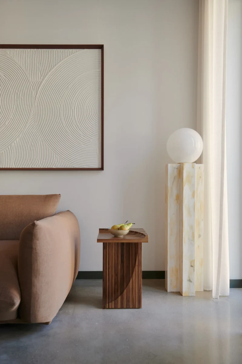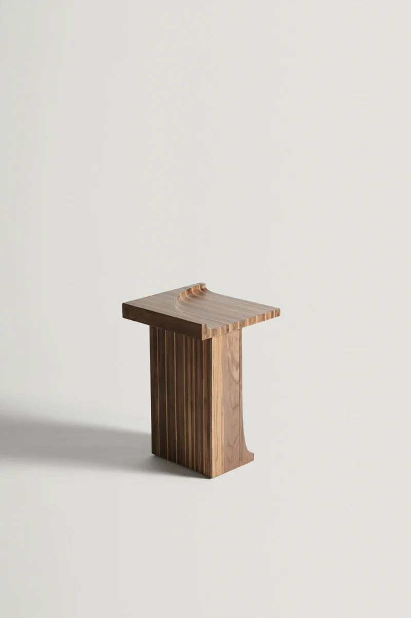 Crafted from repurposed solid walnut and oak wood, the Trama Side Table showcases precise patchwork craftsmanship, elevating the uniqueness of natural timber. This piece blends traditional woodworking techniques with modern manufacturing processes, resulting in a thoughtfully designed, one-of-a-kind piece that celebrates Portugal’s rich heritage of craftsmanship. Whether standing as a bold centerpiece or enhancing a living area, its design balances clean, rational lines with a harmonious interplay of hard and soft elements, creating both visual interest and functionality.