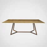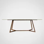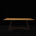 Refined beauty in its element, the Trapeze Dining Table by Nicola Di froscia is made of resined travertine. The steel legs are finished with a Corten effect and are structurally designed to highlight and outline the beauty of the travertine top.