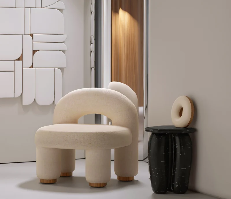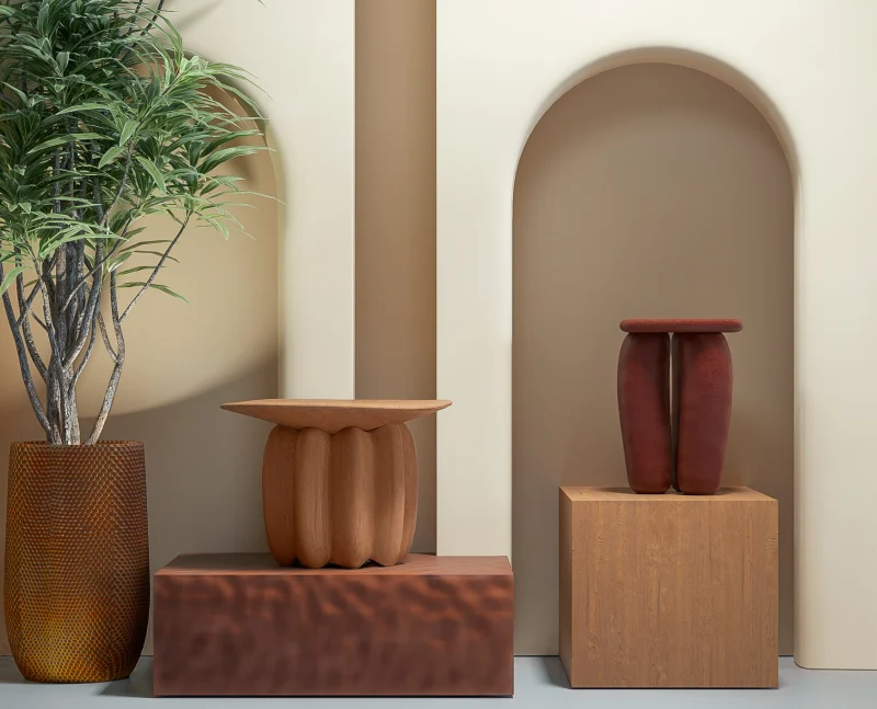 The Trio Accent Table features a small, asymmetrical tabletop paired with legs in an ethnic style, making it a striking addition to any room. Its minimalist design is enhanced with a terrazzo pattern or bright ceramic coating, offering both a modern aesthetic and a cultural touch. This table serves as a versatile accent piece, perfect for elevating any interior with its unique blend of form and function.