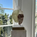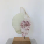 Trois by Meagan Cignoli Studio combines alabaster, stone, fused glass, and wood to create a harmonious blend of organic and modern elements. The piece features a smooth, semi-translucent alabaster section in a soft, light green tone, juxtaposed with a textured, earthy stone in deep red and white hues. These materials are mounted on a sturdy wooden base, elevating the sculpture and adding warmth to the composition. The contrast between the soft curves of the alabaster and the rugged edges of the stone gives the piece a dynamic yet balanced aesthetic.