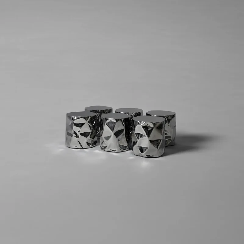 The Tronco Coffee Table is conceived as a modular sculptural system: six stainless-steel forms that gather, separate, and recombine with ease. Inspired by the quiet geometry of tree trunks arranged in nature, each cylinder is shaped to echo the organic irregularity of wood while reimagining it through the precision and reflectivity of metal. What appears solid and heavy is, in fact, unexpectedly light: hydroforming techniques and controlled pressure shape each piece from stainless steel, allowing the form to retain strength while remaining effortlessly movable.