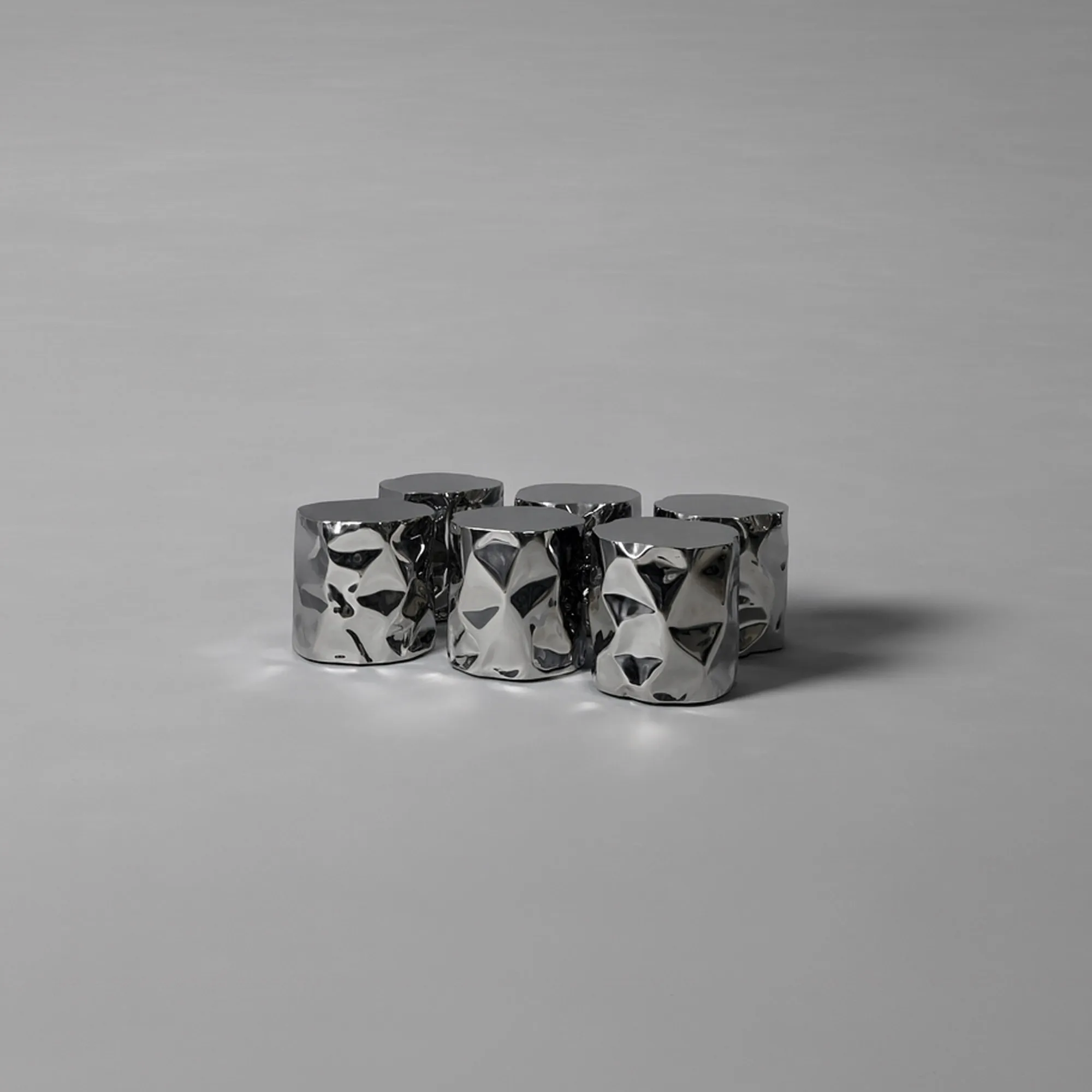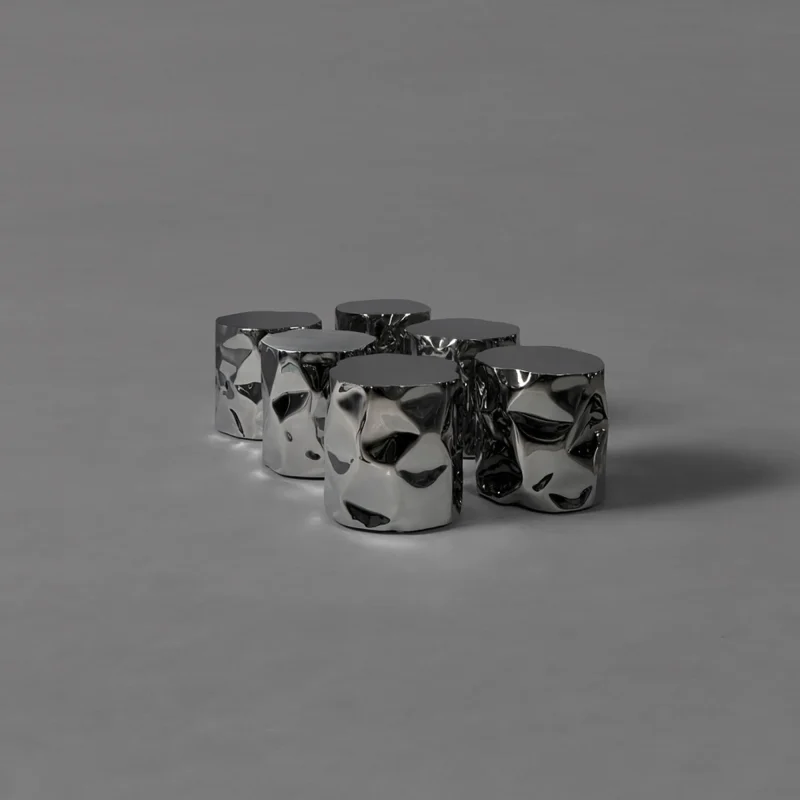 In the studio of Nitush and Aroosh, stainless steel becomes a medium of exploration: pressed, expanded, and refined by hand until its surface folds into a landscape of soft ridges and sharp impressions. These undulations catch and fragment surrounding light, turning each module into a reflective sculpture that changes with the room. Placed together, the six elements create a unified coffee table with a strong architectural presence; arranged apart, they become sculptural accents that shift function as needed. The system is never fixed in place, its identity evolves with the space, inviting fluidity in both form and use.
