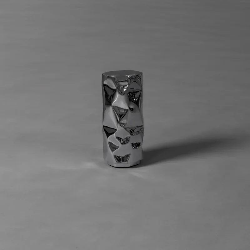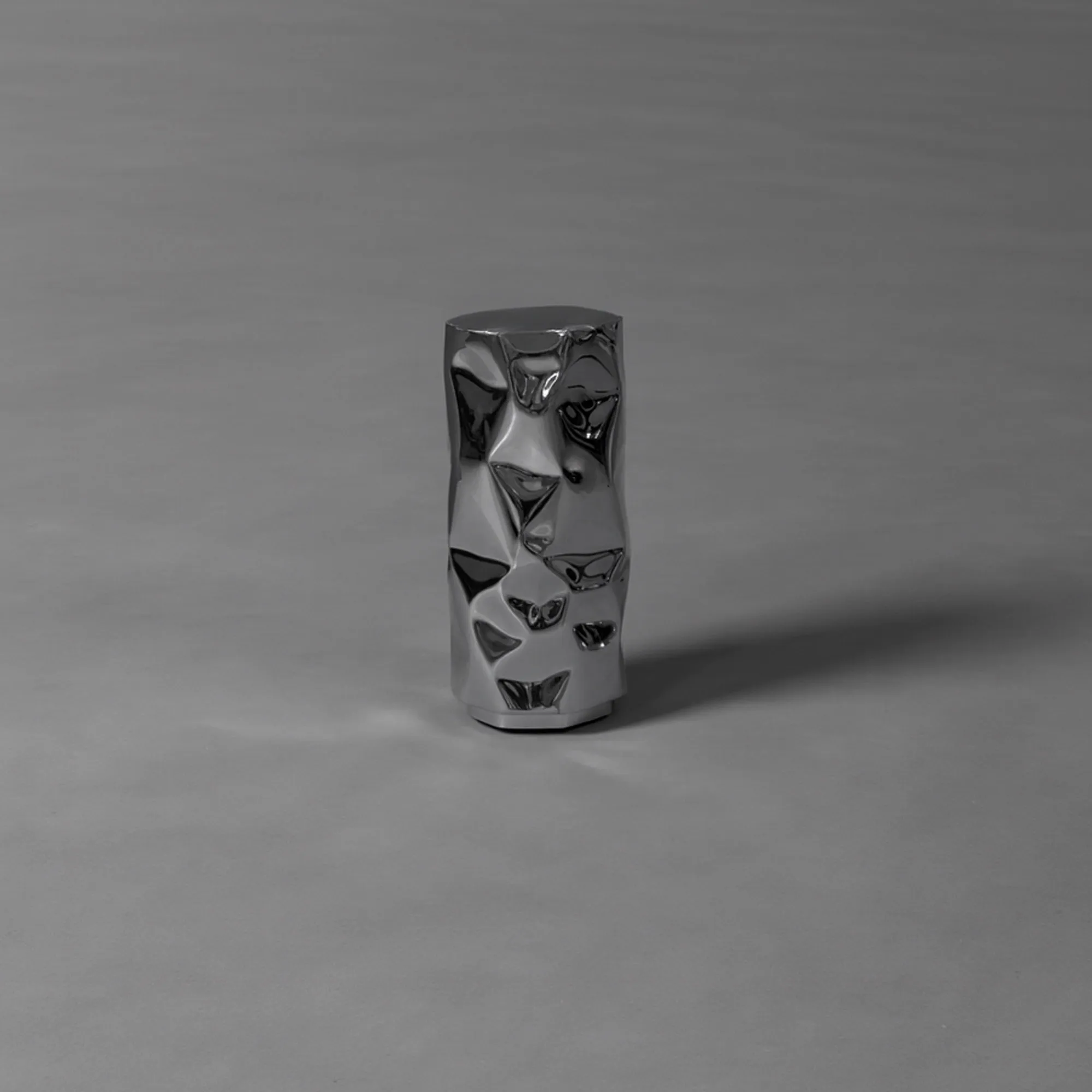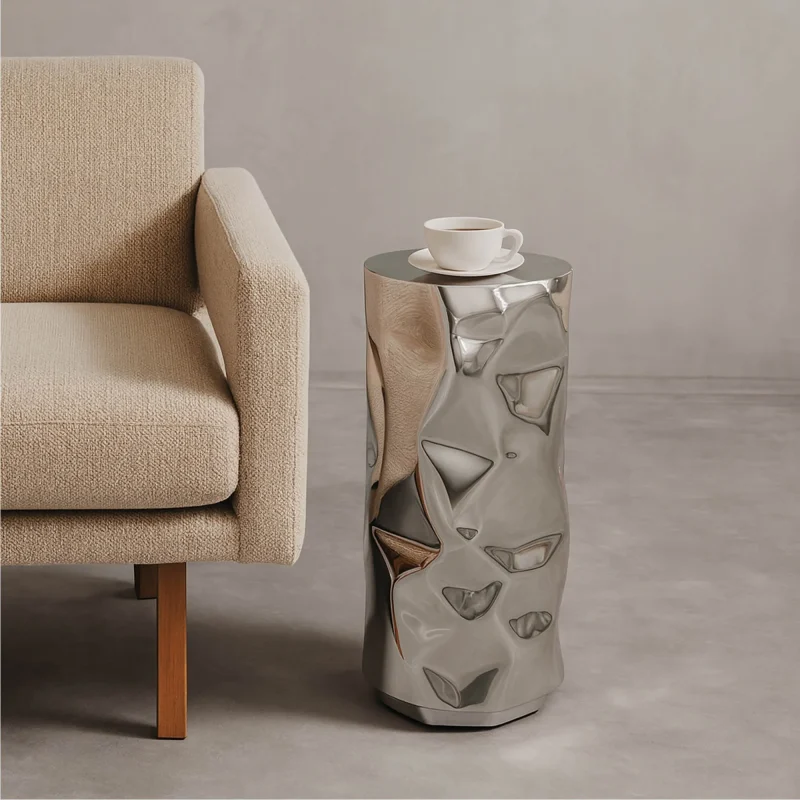 The Tronco Drinks Table distills the core language of the Tronco series into a single sculptural pillar: an intimate, standalone object that brings the expressive surface of hydroformed stainless steel into close proximity. Conceived as both a functional side table and a collectible design piece, its form draws from the natural geometry of tree trunks, translating organic verticality into a reflective, engineered material presence. The cylindrical volume is shaped using controlled hydraulic pressure and refined by hand, resulting in a surface marked by folds, creases and softened vertices that speak to the memory of force. Each indentation and ridge becomes an abstracted echo of motion, suspended in metal.