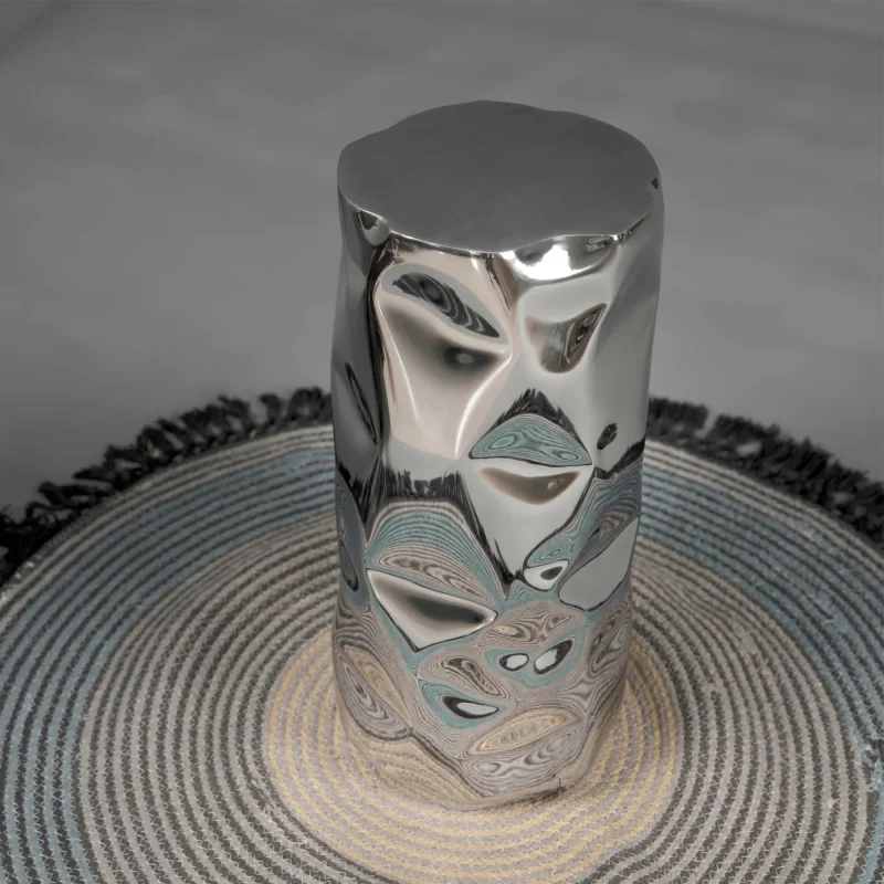 Despite its monolithic appearance, the Tronco Drinks Table is surprisingly lightweight. The stainless-steel shell is closed at the base for stability, while the internal structure remains hollow, allowing the piece to move easily between settings without diminishing its architectural clarity. Whether placed beside a sofa, between armchairs, or used as a sculptural accent in a hallway, it creates a moment of visual intensity: a compact form that captures surrounding light, distorts reflections, and introduces a sense of shifting depth.