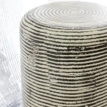 TRUNK stool from the lime plaster series by Martina Dimitrova draws inspiration from the dynamic patterns created by a notched trowel during adhesive application in construction and masonry work. Its surface features bold and rhythmic rotational stripes, reminiscent of the natural patterns found in tree trunks or drops falling onto water. While the pattern seamlessly continues over each radius and plane, a surreal quality is being added to this simple and graphic appearance. Lime is a material that has proven its durability and ability to age over millennia. Through the natural carbonation process, it binds CO₂ from the air and, over time, transforms back into limestone.