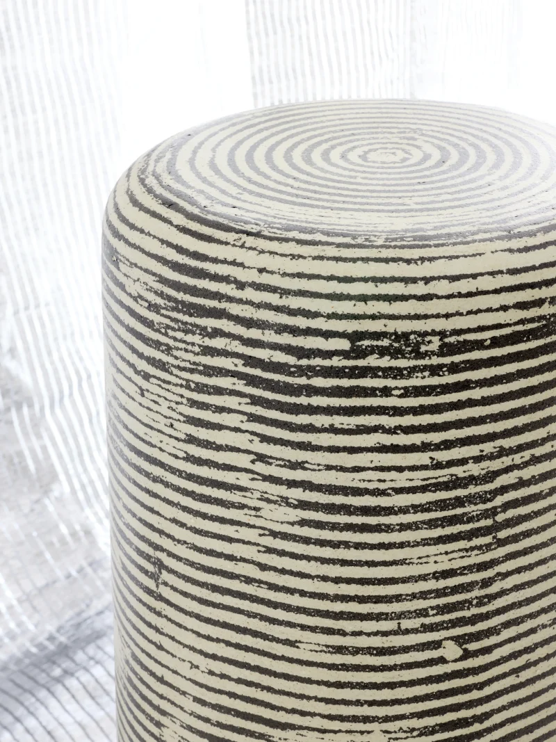 TRUNK stool from the lime plaster series by Martina Dimitrova draws inspiration from the dynamic patterns created by a notched trowel during adhesive application in construction and masonry work. Its surface features bold and rhythmic rotational stripes, reminiscent of the natural patterns found in tree trunks or drops falling onto water. While the pattern seamlessly continues over each radius and plane, a surreal quality is being added to this simple and graphic appearance. Lime is a material that has proven its durability and ability to age over millennia. Through the natural carbonation process, it binds CO₂ from the air and, over time, transforms back into limestone.