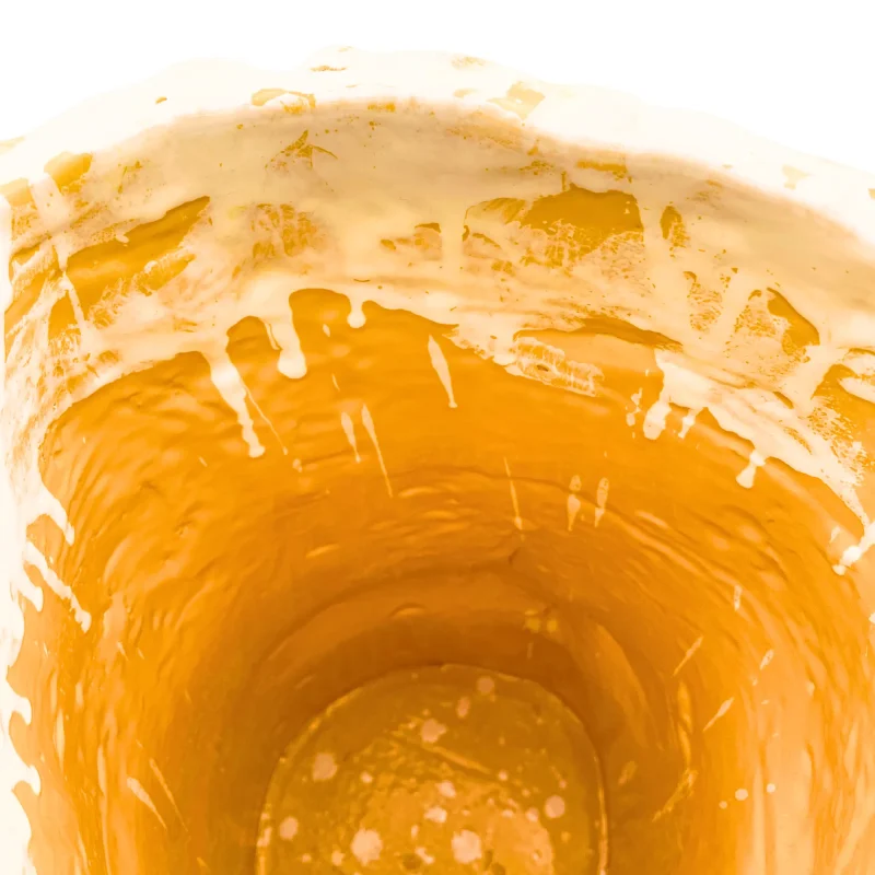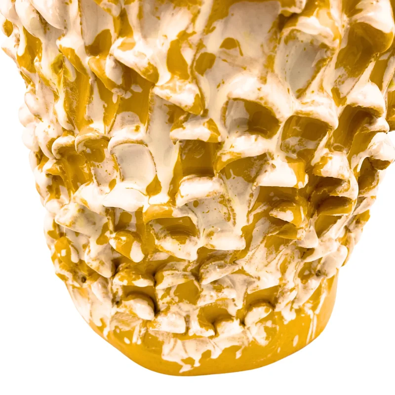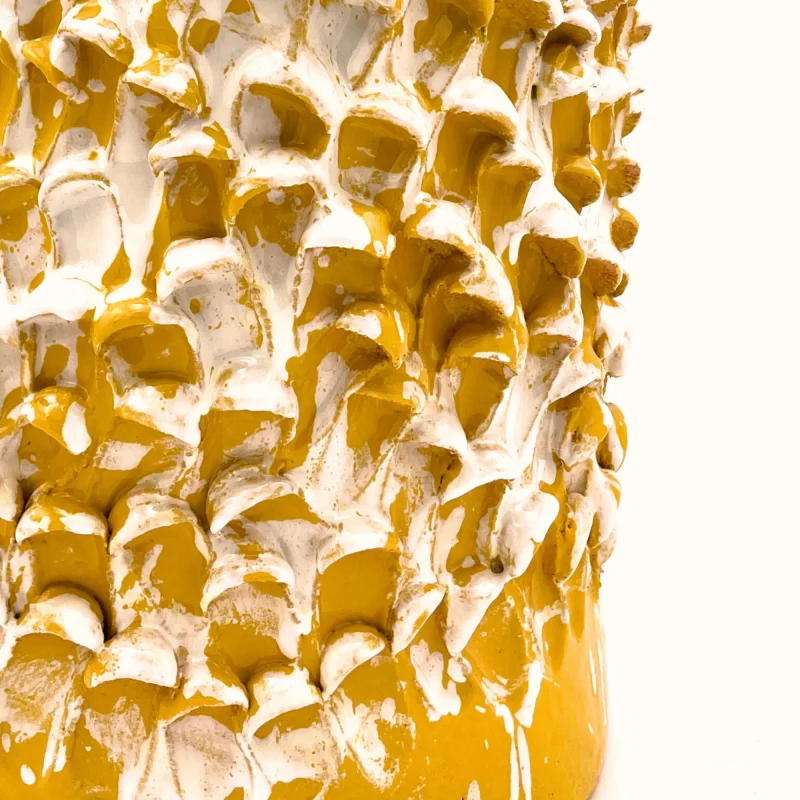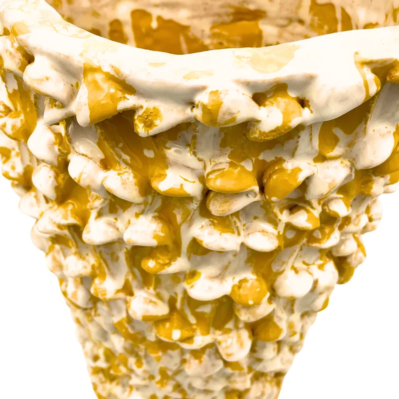 The glaze has been carefully applied to achieve an organic, layered effect, where the glossy yellow contrasts harmoniously with the velvety matte white details. Daria Dazzan develops her creations at the crossroads of design, ceramics, and sculpture. Drawing on her artistic background in haute couture fashion textiles, her works are imbued with a sense of craftsmanship and individuality.