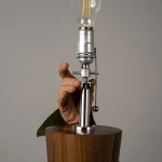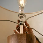 Made in natural parota wood, the two inverted overlapping cones give Tulipán a shape that suggests a quite charming female proportion. Its broad and robust fiberglass linen-lined lampshade can last a lifetime. It uses a low-watt LED light that lasts up to 18 years and saves 90% of energy consumption.