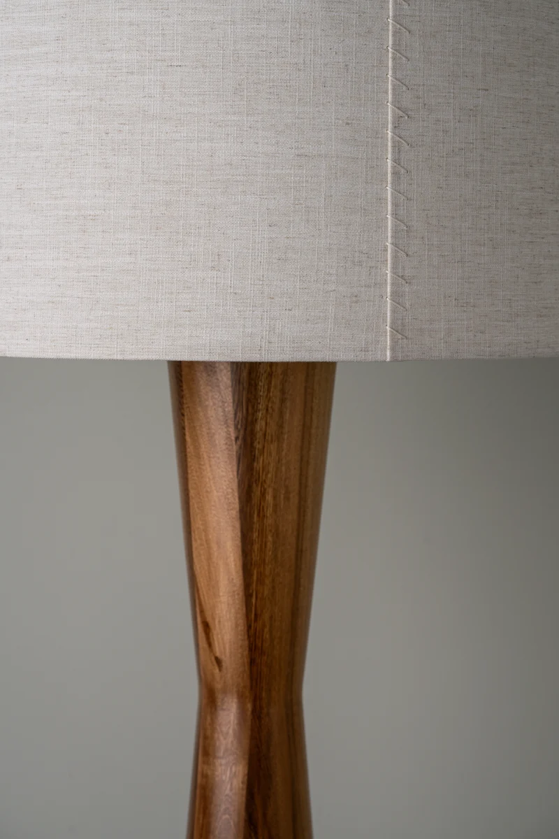 Turned parota base with matte finish and sturdy lampshade with fiberglass and linen.