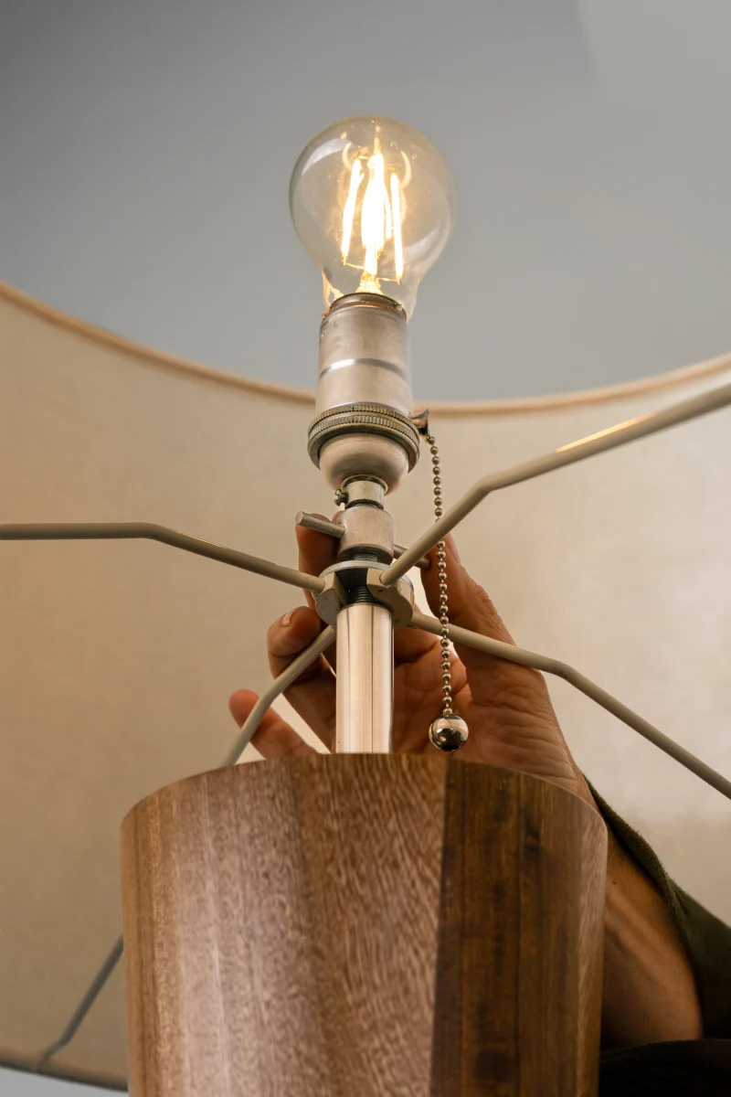 Made in natural parota wood, the two inverted overlapping cones give Tulipán a shape that suggests a quite charming female proportion. Its broad and robust fiberglass linen-lined lampshade can last a lifetime. It uses a low-watt LED light that lasts up to 18 years and saves 90% of energy consumption.