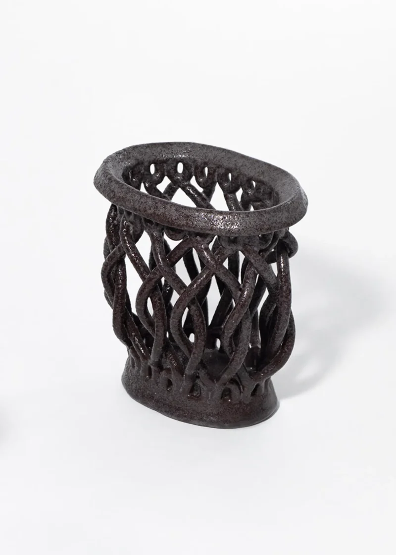 The ‘Twisted Willow’ collection by Lia Raquel Marques, references basketry that uses oak and willow for making sturdy, functional objects, experimenting with various weaving patterns in a small scale. Using brown clay and glaze experiments to create detailed baskets while recreating certain aspects of wooden baskets such as the robust structure and colour while using delicate textural features.