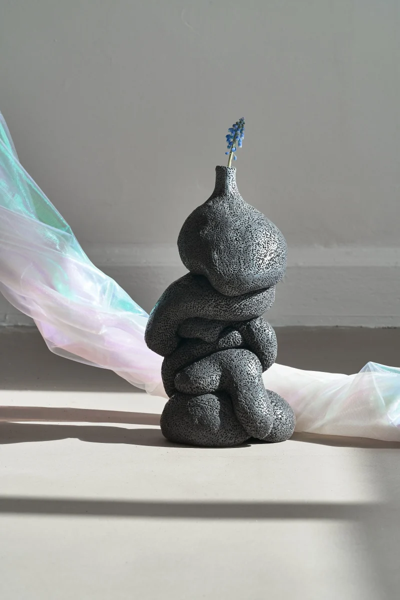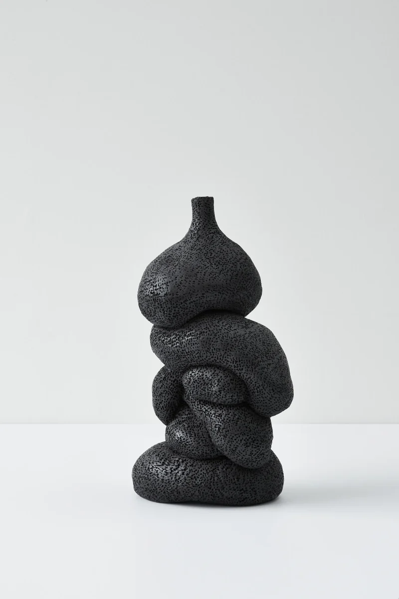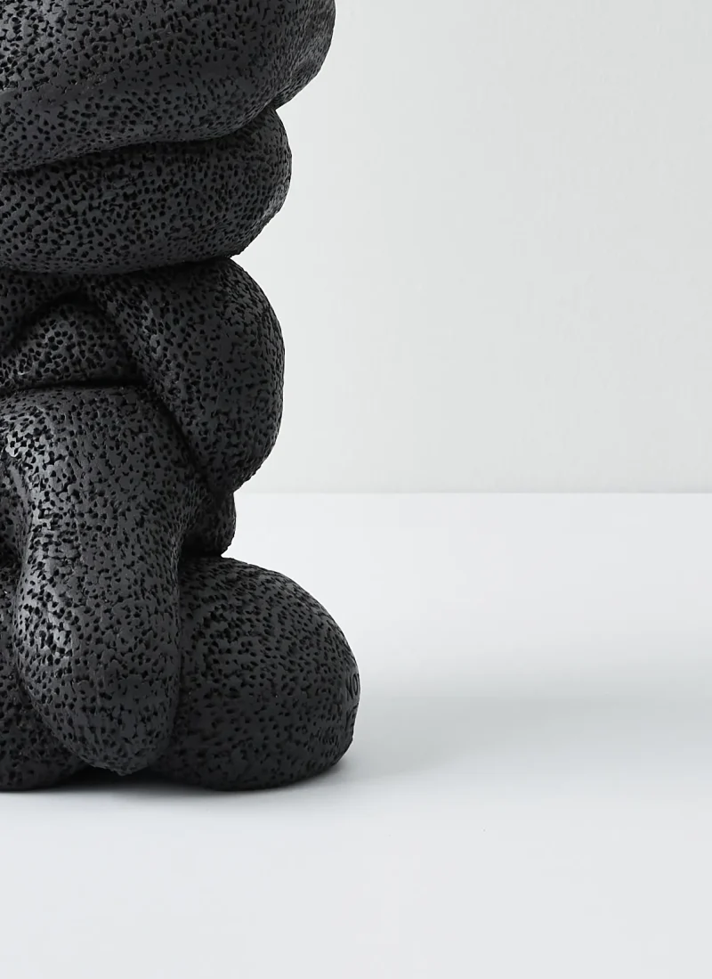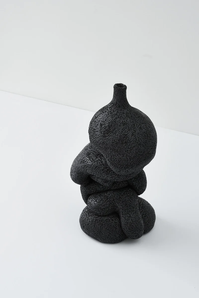 This black stoneware sculpture captures the essence of molten stone, seemingly frozen amid a dynamic transformation. Its organic, compact form exudes a sense of fluidity and motion, as if caught between states of solid and liquid. The playful contours and textured surface reflect the artist’s intuitive and spontaneous creative process, resulting in a raw and deliberate piece.