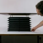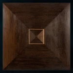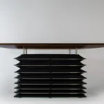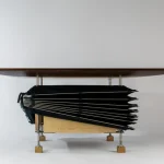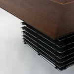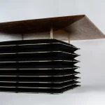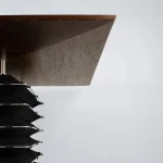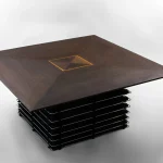 This unique coffee table is the latest addition to Szostak’s “Finish Collection”. The table’s square top features a classic mosaic pattern, divided into four square sections, that adds a timeless element to the design. The wood grain pattern of the wenge wood veneer is beautifully highlighted on the side, further enhancing the table’s visual appeal. The table’s leg draws inspiration from the shape of camera bellows, adding a contemporary and unexpected touch to the overall aesthetic. The leg’s accordion-like form complements the traditional feel of the tabletop, creating a harmonious balance between classic and modern design elements.