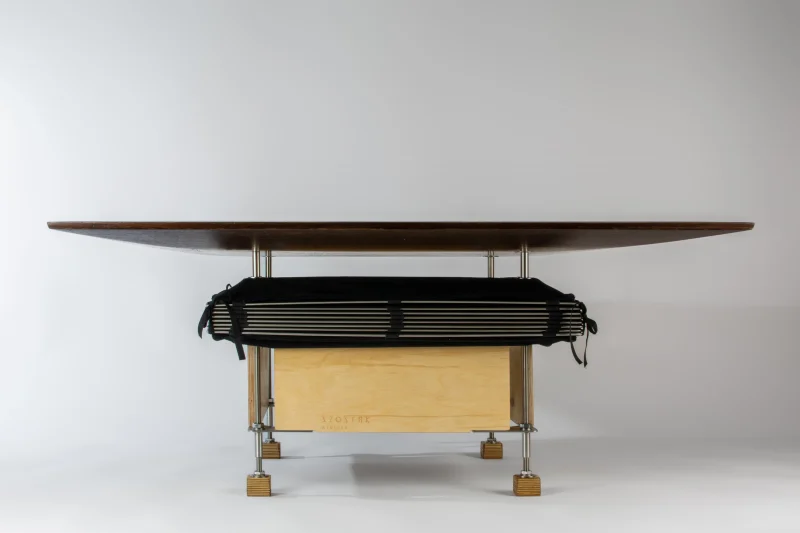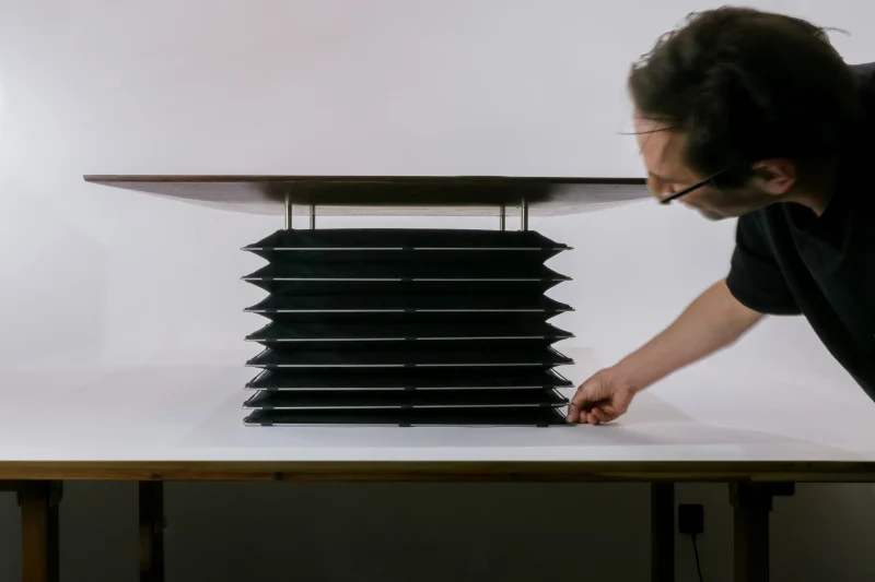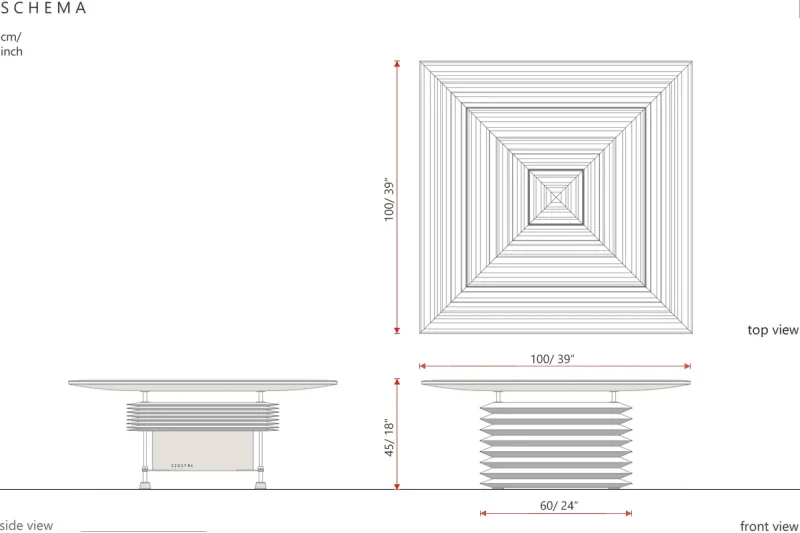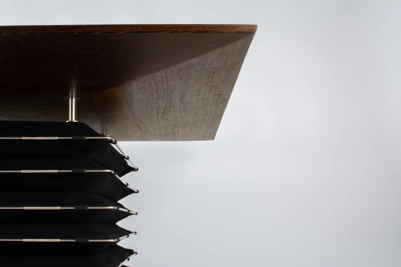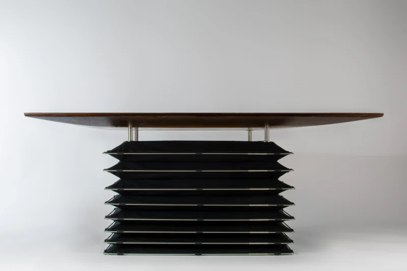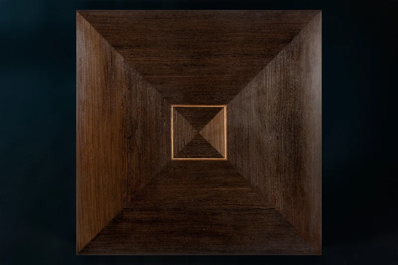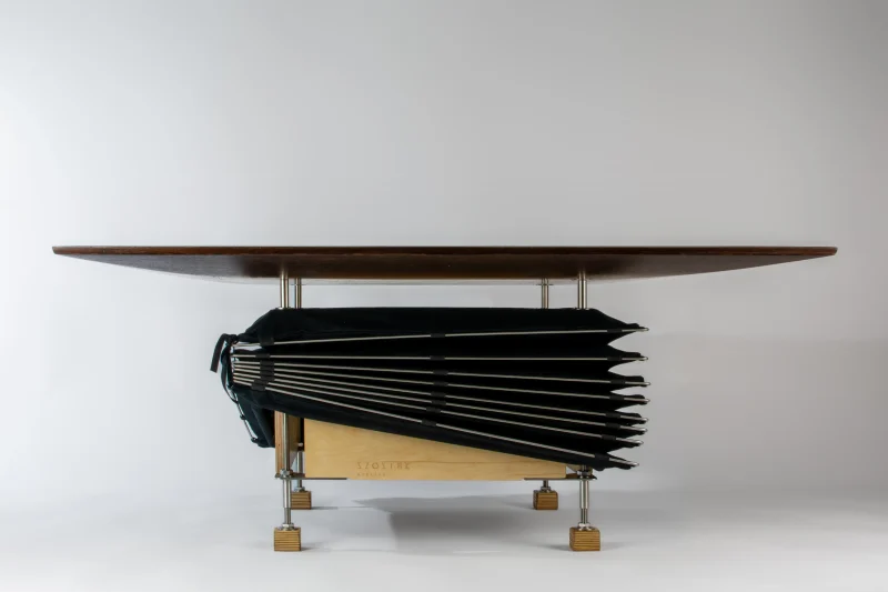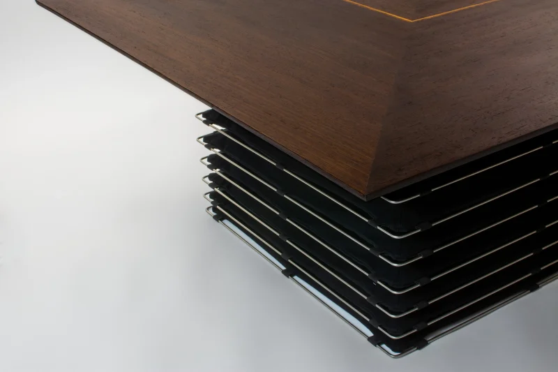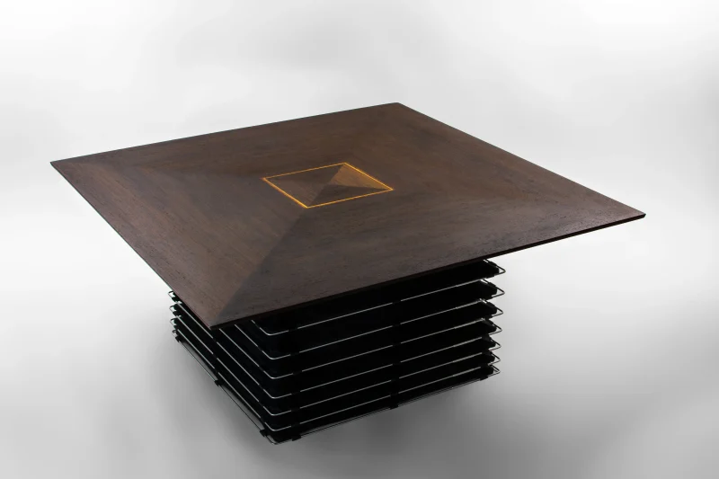 This unique coffee table is the latest addition to Szostak’s “Finish Collection”. The table’s square top features a classic mosaic pattern, divided into four square sections, that adds a timeless element to the design. The wood grain pattern of the wenge wood veneer is beautifully highlighted on the side, further enhancing the table’s visual appeal. The table’s leg draws inspiration from the shape of camera bellows, adding a contemporary and unexpected touch to the overall aesthetic. The leg’s accordion-like form complements the traditional feel of the tabletop, creating a harmonious balance between classic and modern design elements.