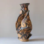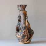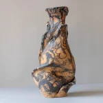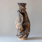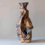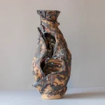 A one-of-a-kind stoneware sculpture, intuitively shattered during its creation to discover new pathways forming an unconventional vase. Intervened with a combination of personal formulated glazes. This piece, titled “Unshell Your Heart,” breathes life into the traditional vase by shaping it into a heart. When viewed from every angle, it transforms like a seashell becoming a heart, embodying the essence of metamorphosis and renewal. Vases hold memories and stories, i would like to discover them.