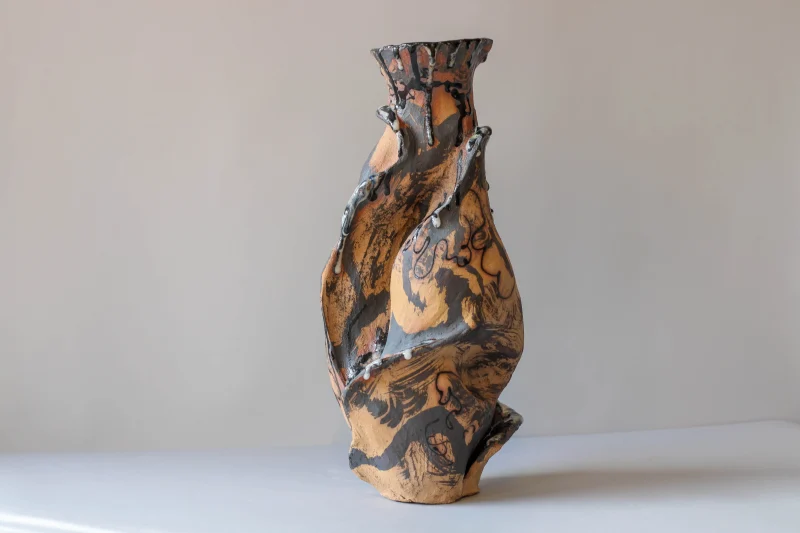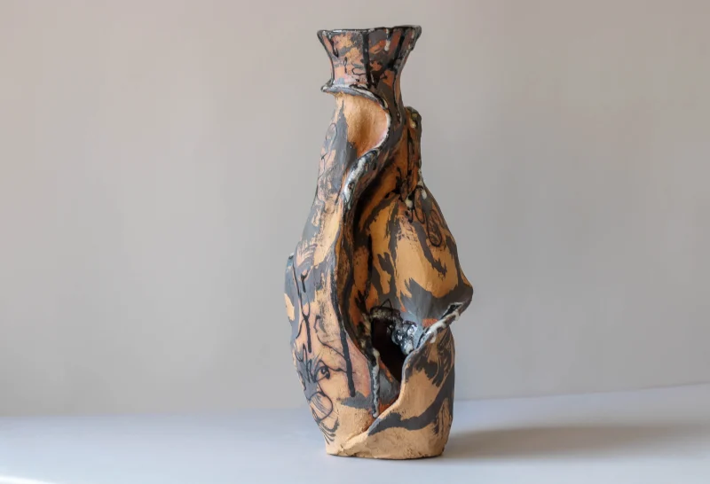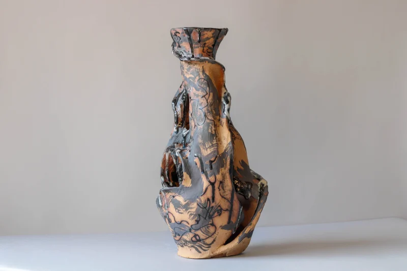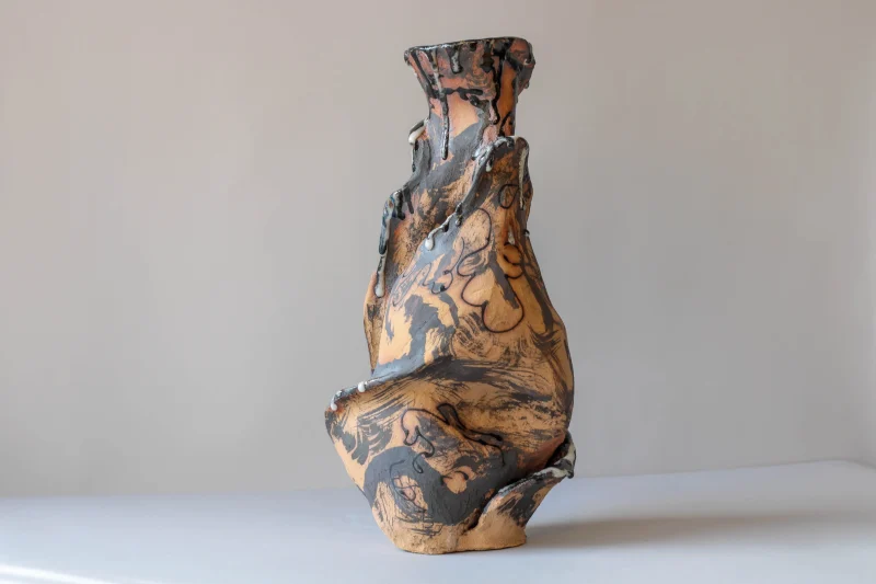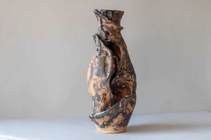 A one-of-a-kind stoneware sculpture, intuitively shattered during its creation to discover new pathways forming an unconventional vase. Intervened with a combination of personal formulated glazes. This piece, titled “Unshell Your Heart,” breathes life into the traditional vase by shaping it into a heart. When viewed from every angle, it transforms like a seashell becoming a heart, embodying the essence of metamorphosis and renewal. Vases hold memories and stories, i would like to discover them.