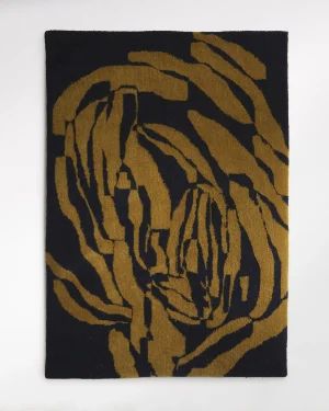 Justyna is a Polish artist/designer based in London, who works primarily with textiles, creating pieces that begin as quick digital sketches, spontaneous, instinctive gestures that aim to capture movement before it slips away. At the core of the practice lies the translation of something fleeting and intuitive into something material and structured. She is drawn to sharp, angular forms and rhythmic compositions that feel bold yet considered.A muted palette defines much of the work, with colour used sparingly. Black plays a central role, adding weight and depth while creating a quiet intensity that allows the forms to take centre stage. There is a stillness the artist continually seeks to preserve, even when the shapes assert themselves with a certain loudness. Often described as brutalist, stark, or architectural, almost monolithic, the work is equally concerned with tactility and the impulse to touch. That sensory connection, intrinsic to textile art, is an essential part of the experience.Every decision in the process is intentional, particularly when it comes to materials. She uses 100% New Zealand wool for its natural strength and softness and has replaced the standard polyester backing with organic hemp, a fast-growing, low-impact, and biodegradable alternative. This choice reflects a commitment to responsible making. Each piece is handcrafted, tufted, and stitched slowly and carefully, guided by the belief that process carries as much meaning as outcome.