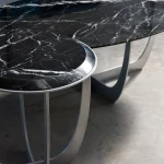 Available in two striking variations, VALENTINE offers a choice between a black Marquinia marble top on a silver-plated metal base, and a white marble top on a bronze base. Each option presents a unique, customizable statement piece that elegantly blends contemporary style with space-age and art-deco elements.
