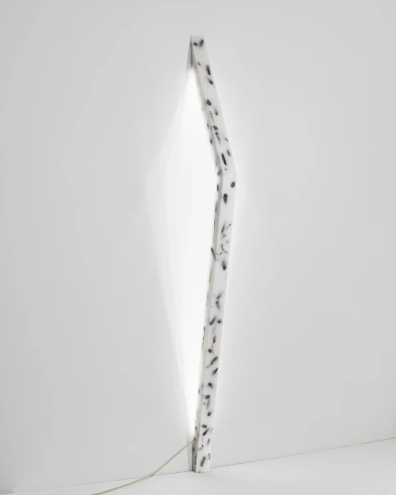 The result is a wall sculpture which transforms when it is lit up. The shadows take over the shape and give the piece a new representation.