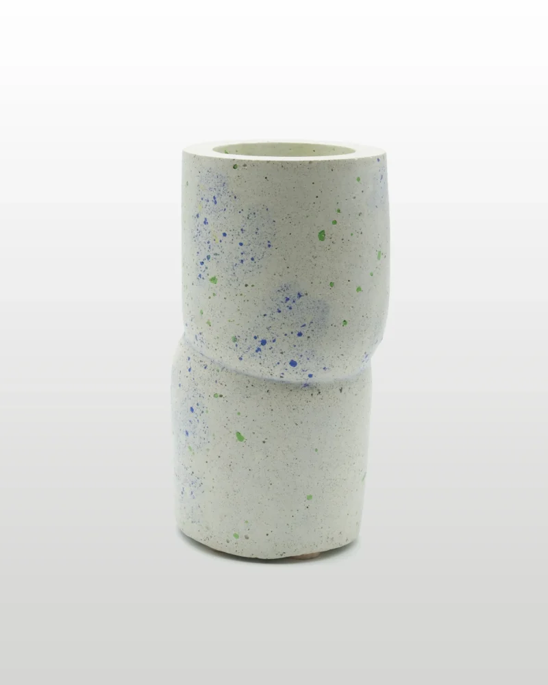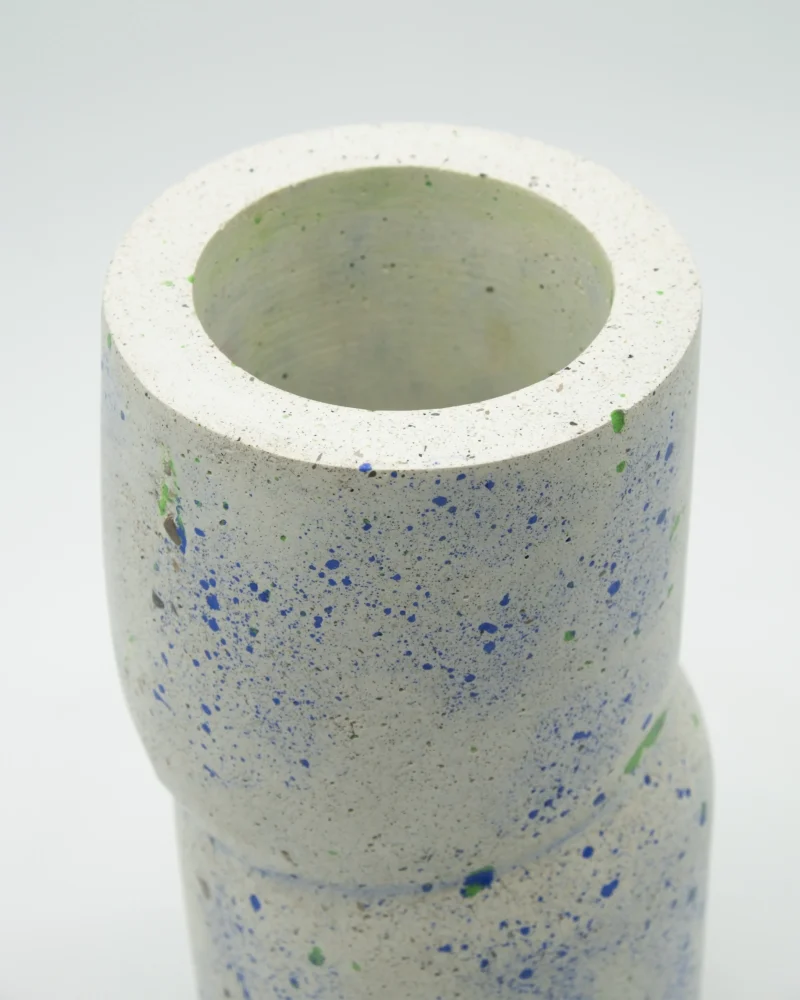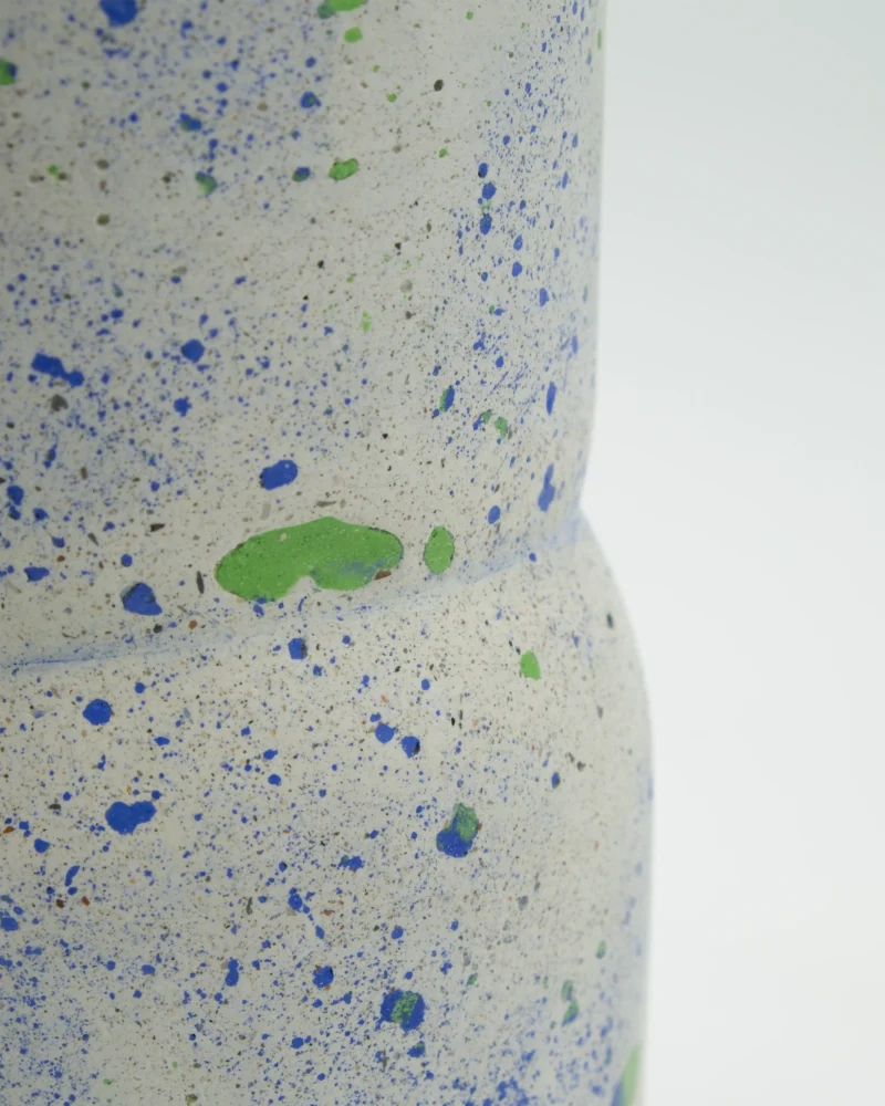 This vase was casted in a light grey terrazzo, it was filled with green and blue plaster and then hand sanded to give it the finish of a smooth natural stone.