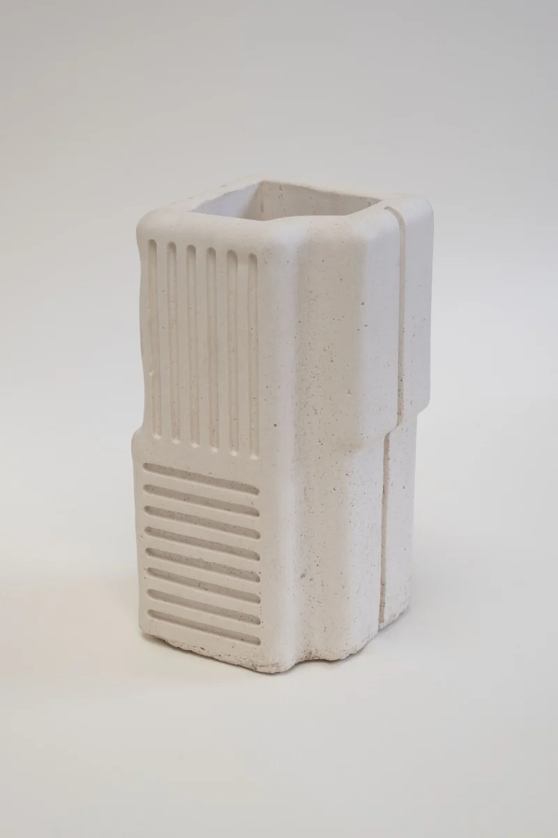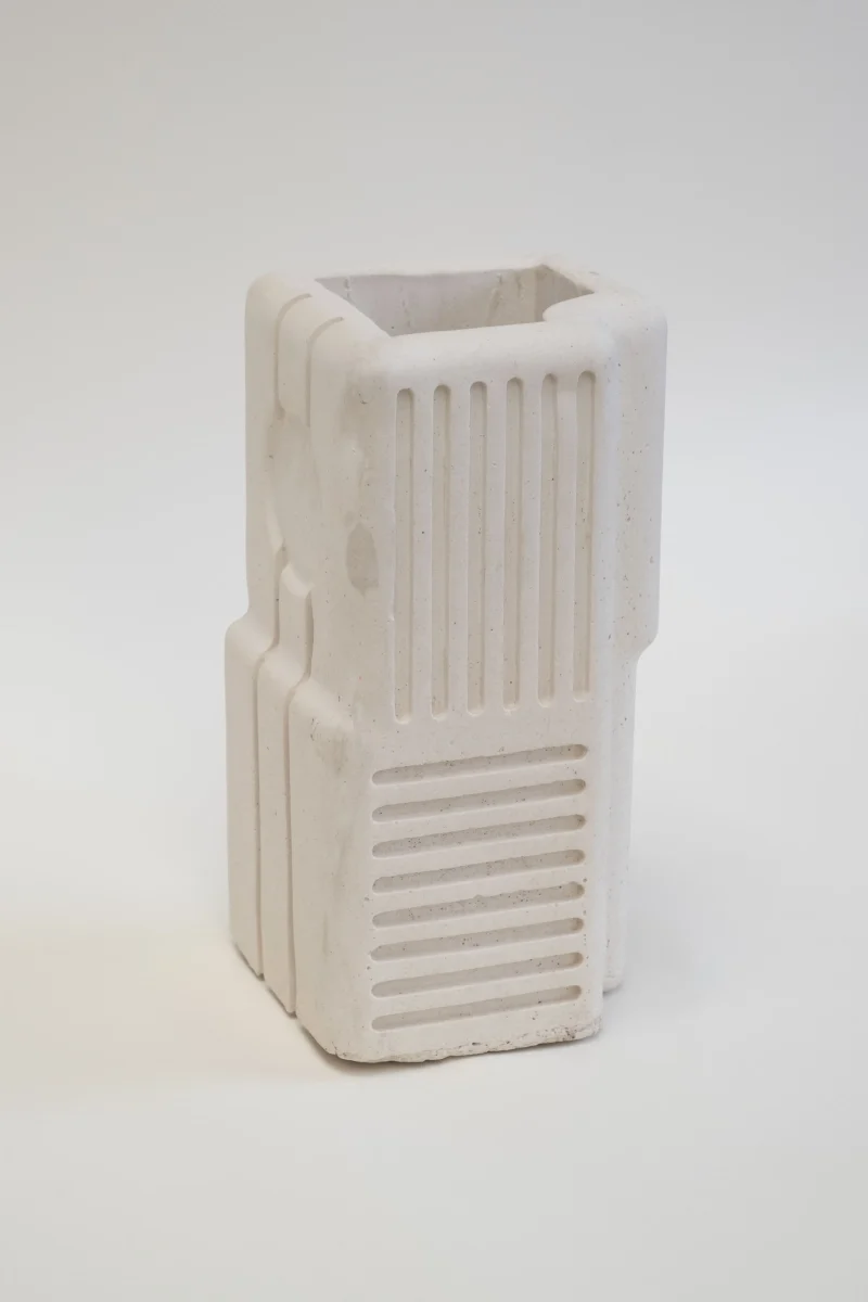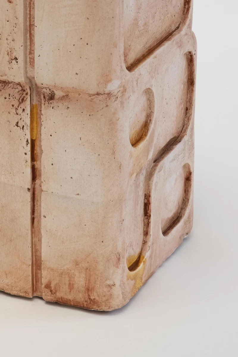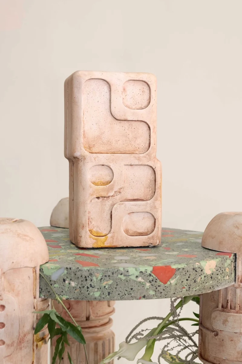 The objects and furniture in the collection are artifacts of a technological world running on auto-pilot. A specially formulated plaster is the primary material, complemented by terrazzo, wood elements, and unique stoneware pieces.