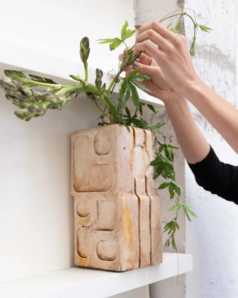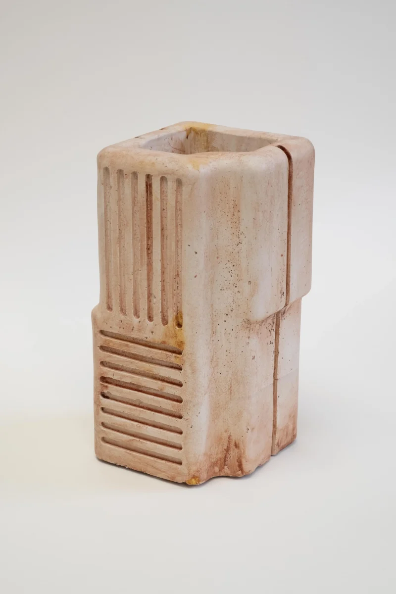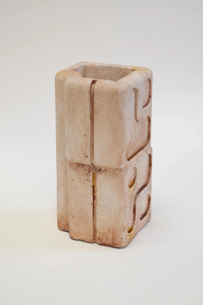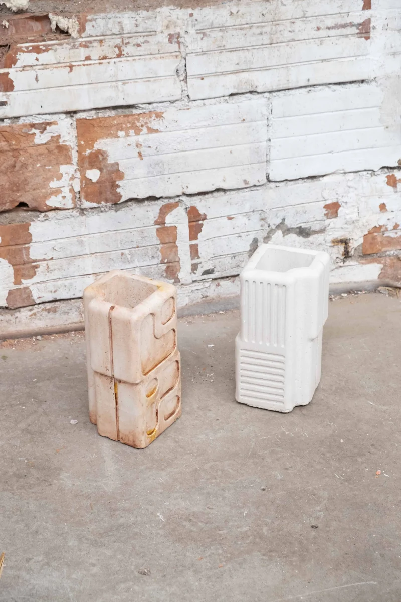 The objects and furniture in the collection are artifacts of a technological world running on auto-pilot. A specially formulated plaster is the primary material, complemented by terrazzo, wood elements, and unique stoneware pieces.