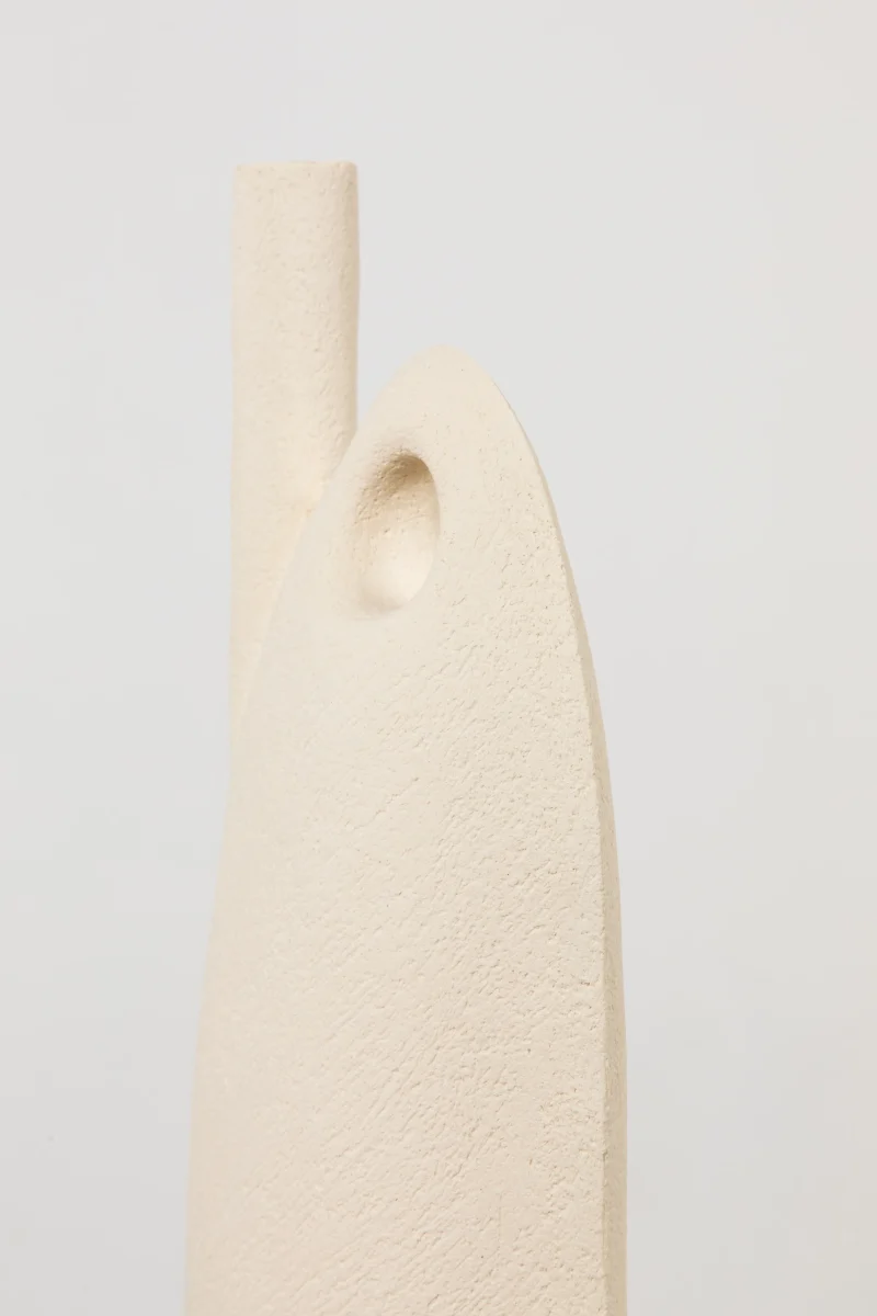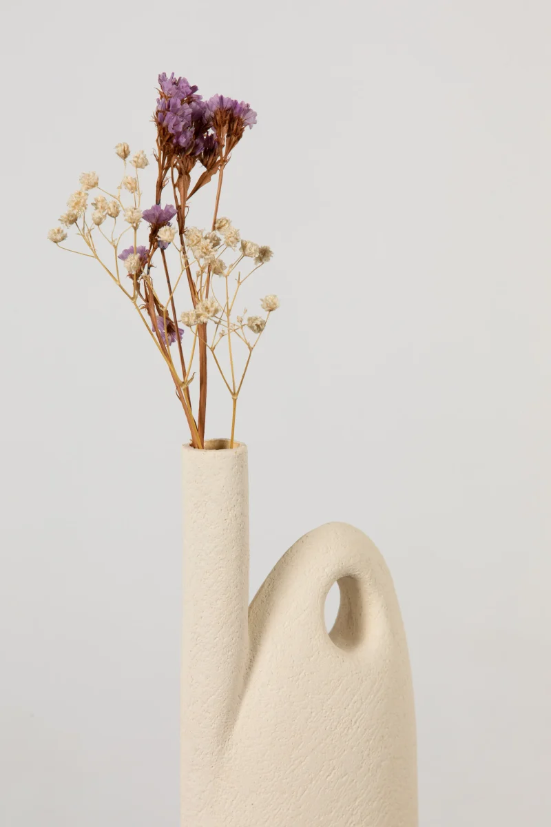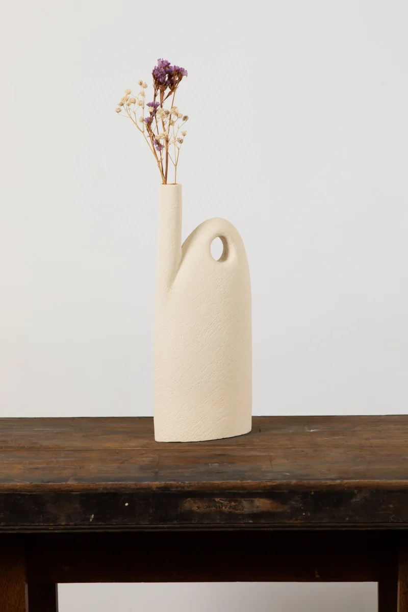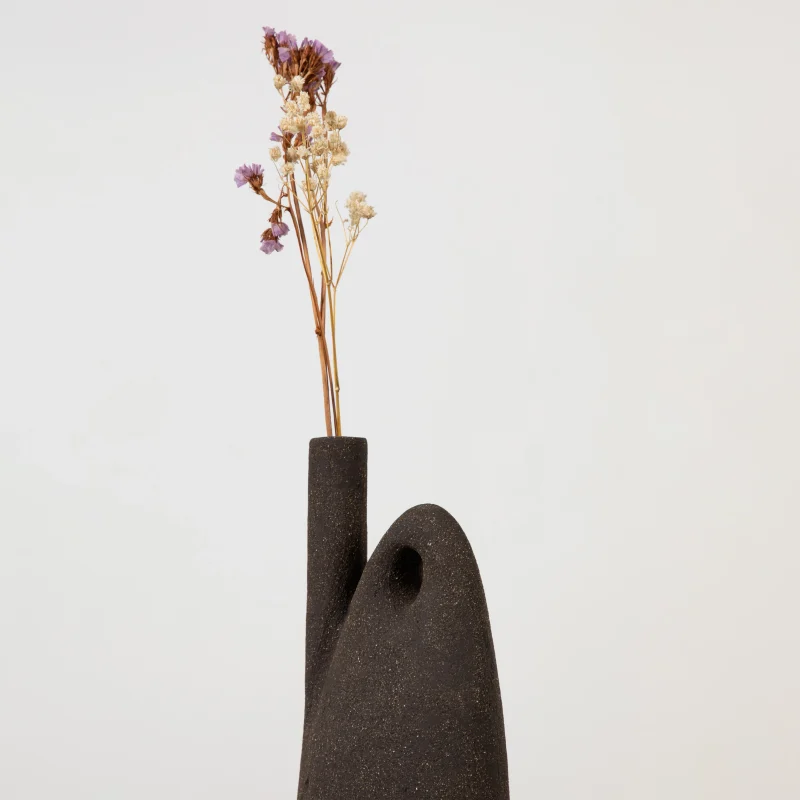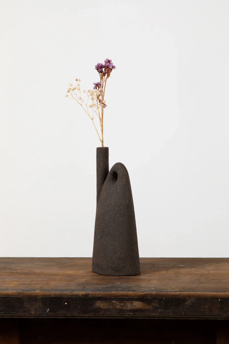 Sculptural ceramic vase by England-based designer, melo clay, handmade from black vulcanic clay. It is watertight and can be used as a vase or a water jug as well as a decor item for your home.