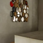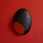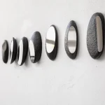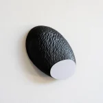 The result is a collection of eight series of objects crafted from various woods, including oak, maple, birch, beech, American walnut, red oak, elm, and Canadian maple. Each series contains seven shape variations that together can be associated with the phases of the moon moving across the sky. They are finished using distinct techniques. One series is hand-carved and coated with ink and black wax; another is stained in multiple colors and sealed with linseed oil or hard-oil wax; a third is hand-painted with dyes in different hues. The remaining five series are treated with oil or wax to emphasize the natural wood grain. Each form can be wall-mounted in six different orientations using a specially designed hanger.