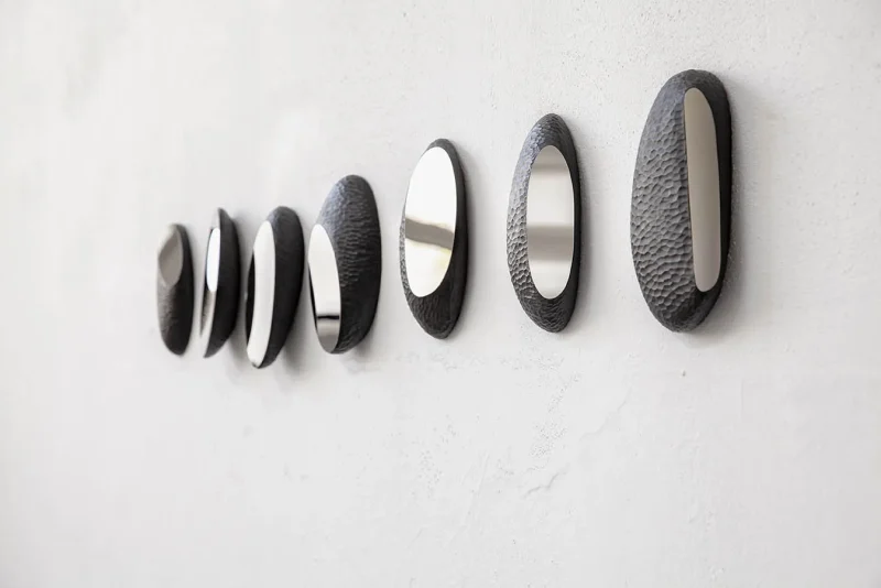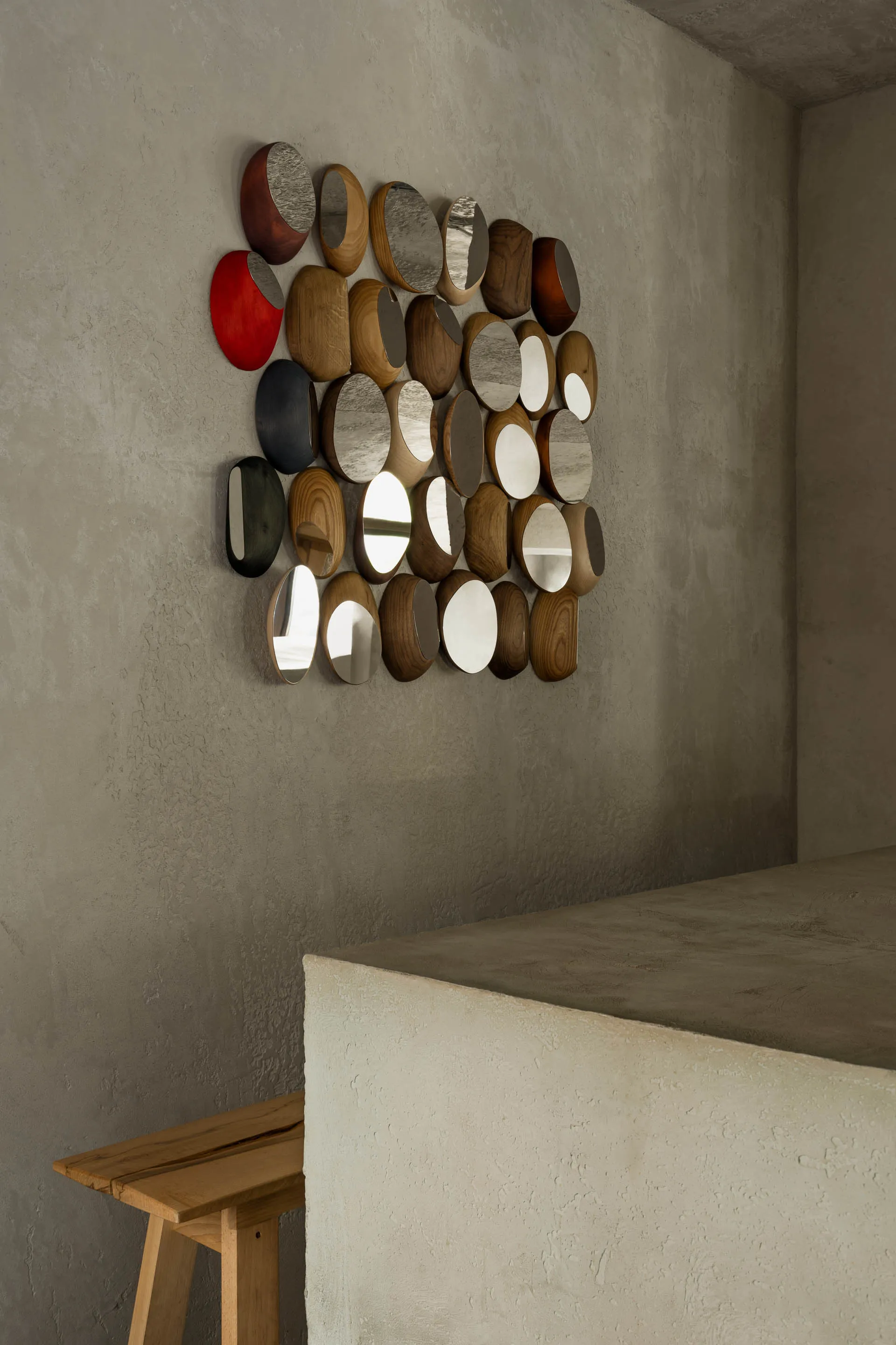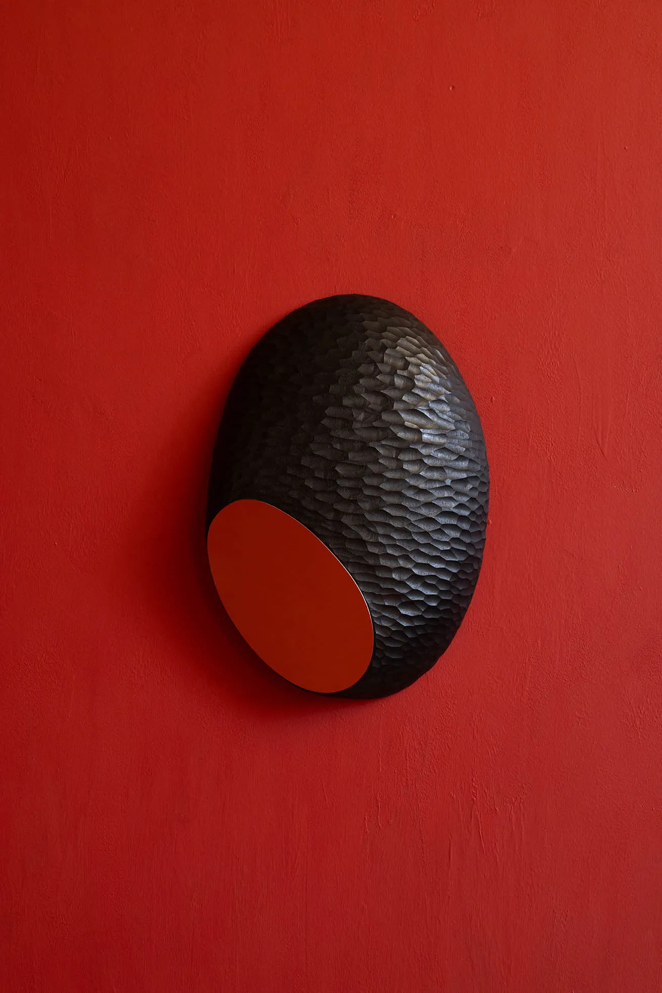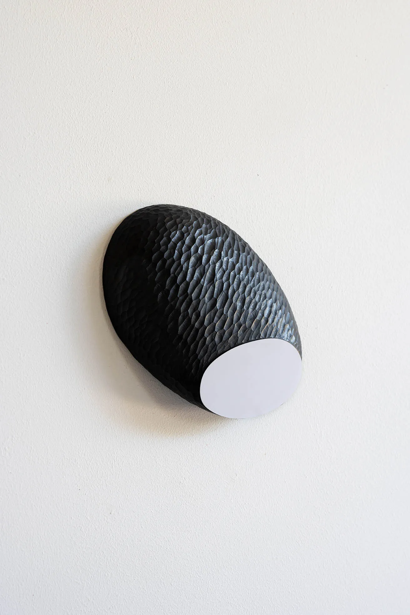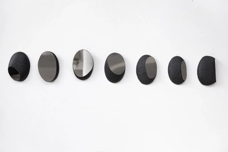 The result is a collection of eight series of objects crafted from various woods, including oak, maple, birch, beech, American walnut, red oak, elm, and Canadian maple. Each series contains seven shape variations that together can be associated with the phases of the moon moving across the sky. They are finished using distinct techniques. One series is hand-carved and coated with ink and black wax; another is stained in multiple colors and sealed with linseed oil or hard-oil wax; a third is hand-painted with dyes in different hues. The remaining five series are treated with oil or wax to emphasize the natural wood grain. Each form can be wall-mounted in six different orientations using a specially designed hanger.