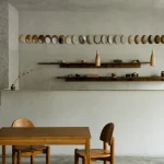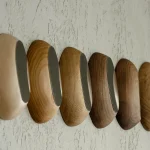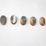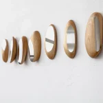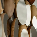 The result is a collection of eight series of objects crafted from various woods, including oak, maple, birch, beech, American walnut, red oak, elm, and Canadian maple. Each series contains seven shape variations that together can be associated with the phases of the moon moving across the sky. They are finished using distinct techniques. One series is hand-carved and coated with ink and black wax; another is stained in multiple colors and sealed with linseed oil or hard-oil wax; a third is hand-painted with dyes in different hues. The remaining five series are treated with oil or wax to emphasize the natural wood grain. Each form can be wall-mounted in six different orientations using a specially designed hanger.