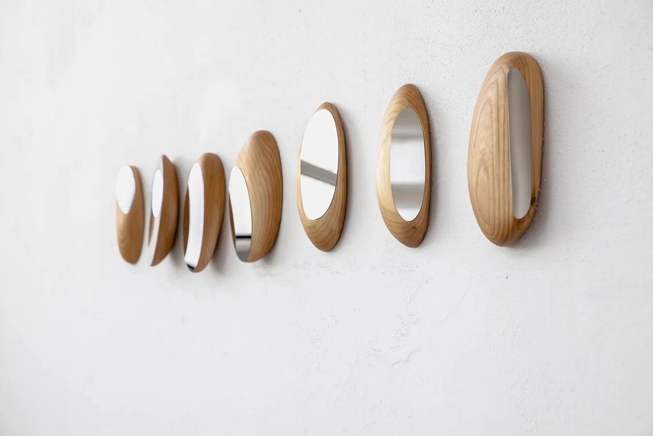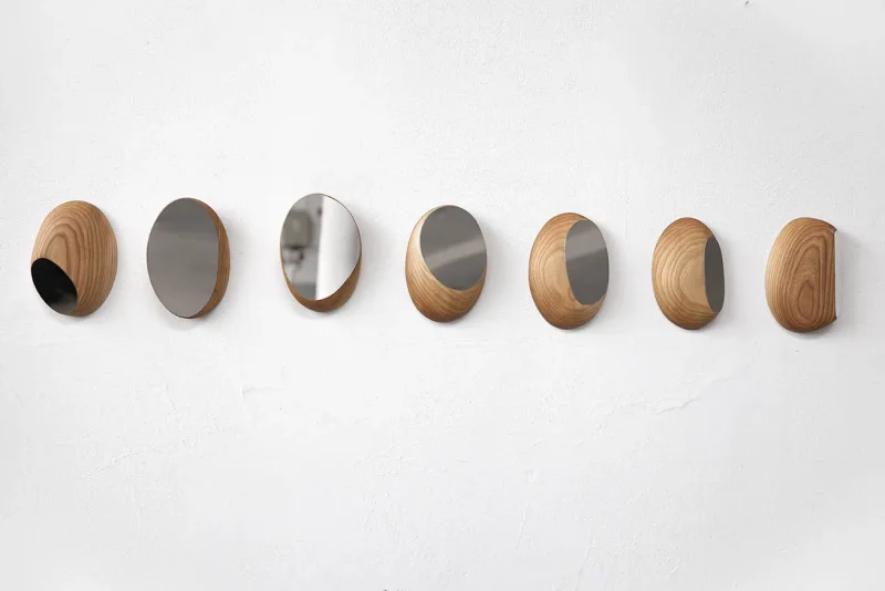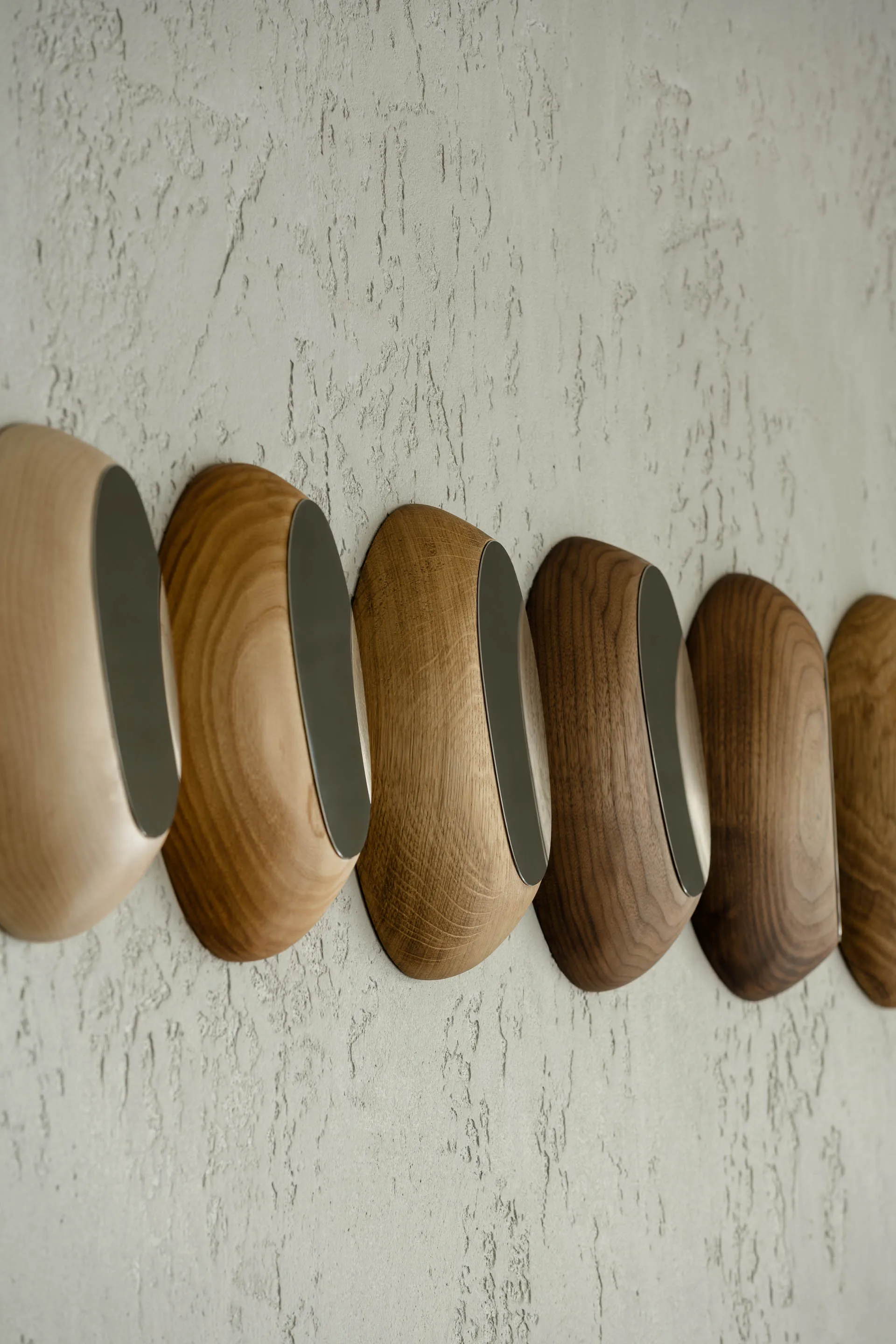 The result is a collection of eight series of objects crafted from various woods, including oak, maple, birch, beech, American walnut, red oak, elm, and Canadian maple. Each series contains seven shape variations that together can be associated with the phases of the moon moving across the sky. They are finished using distinct techniques. One series is hand-carved and coated with ink and black wax; another is stained in multiple colors and sealed with linseed oil or hard-oil wax; a third is hand-painted with dyes in different hues. The remaining five series are treated with oil or wax to emphasize the natural wood grain. Each form can be wall-mounted in six different orientations using a specially designed hanger.