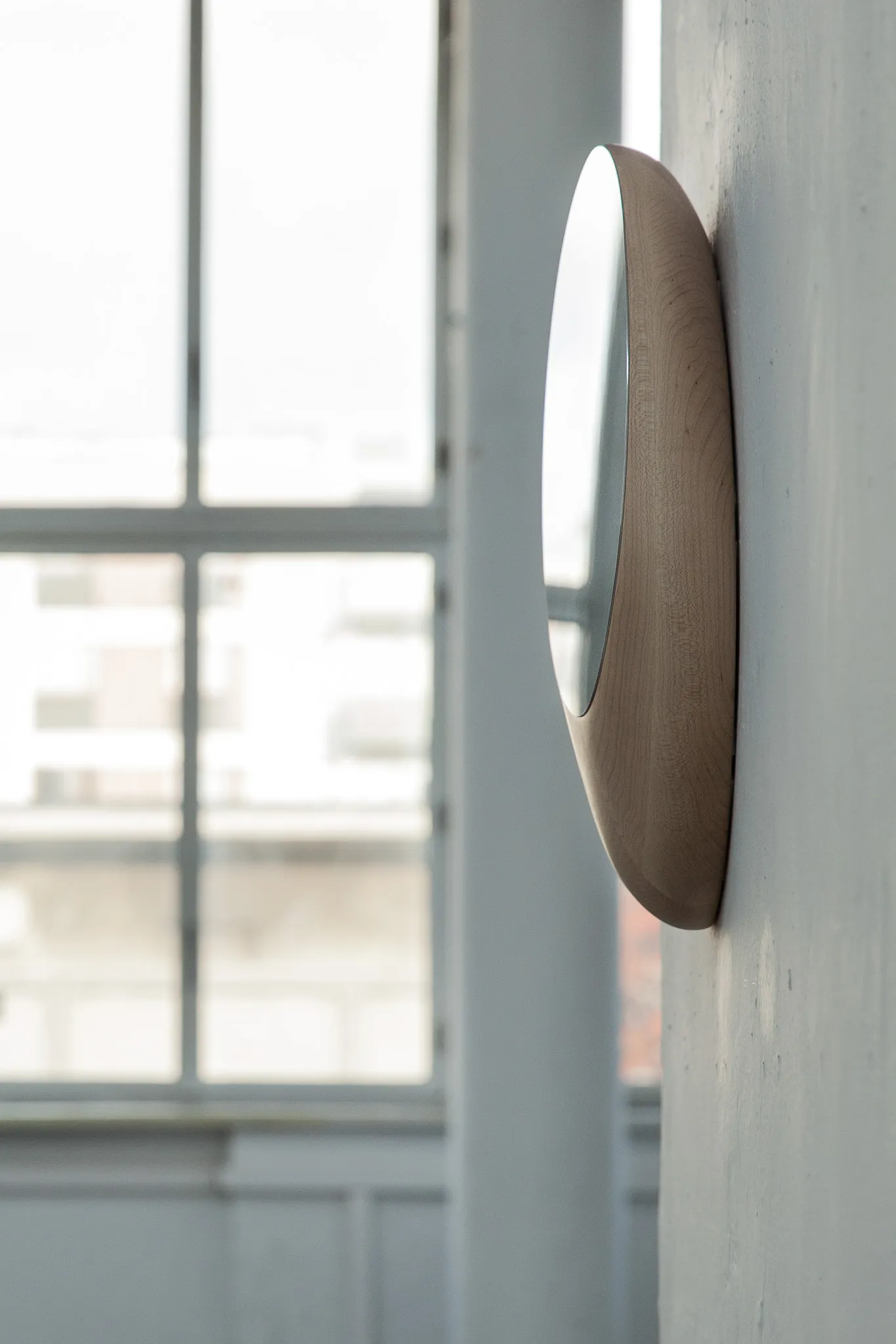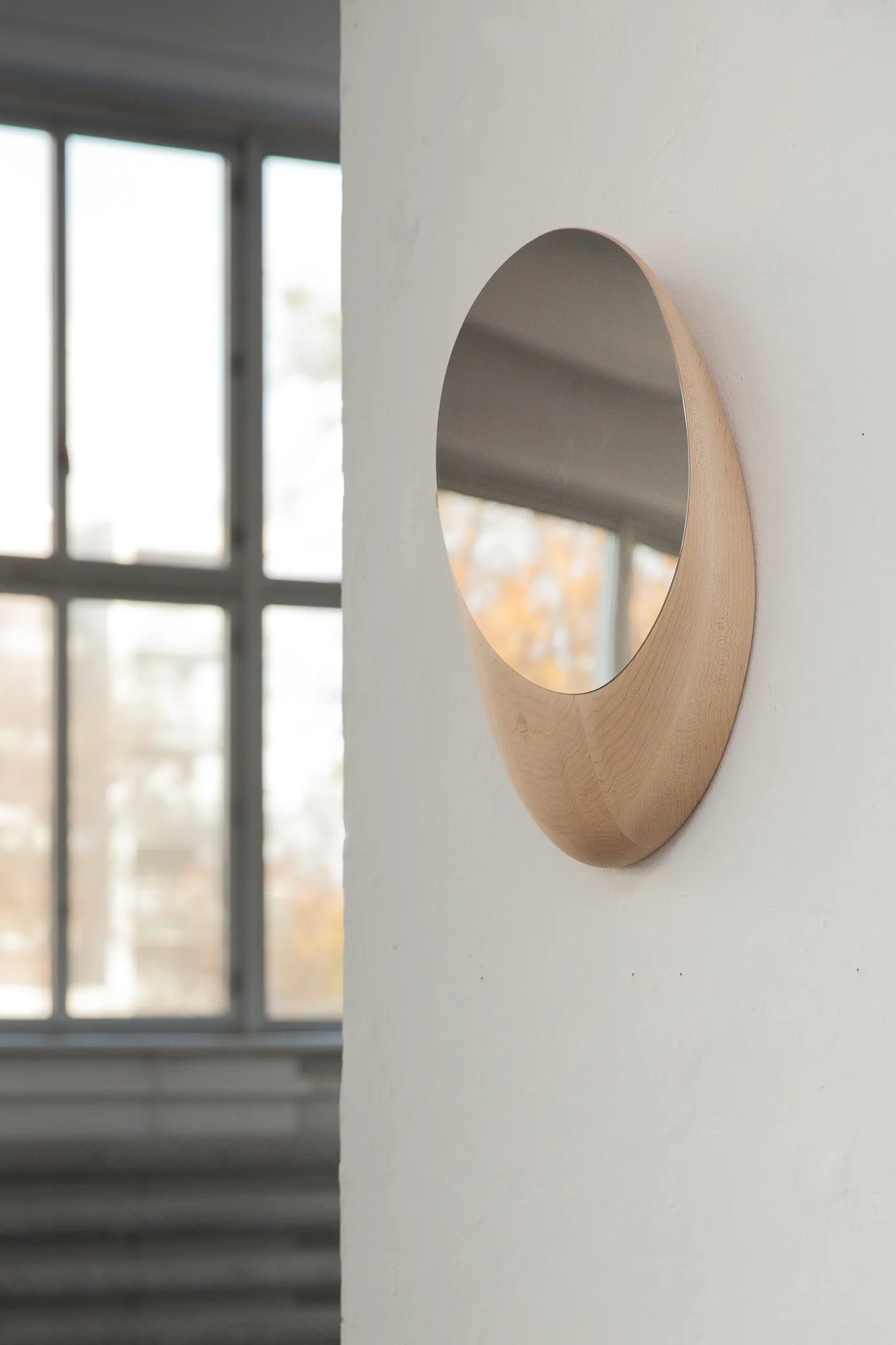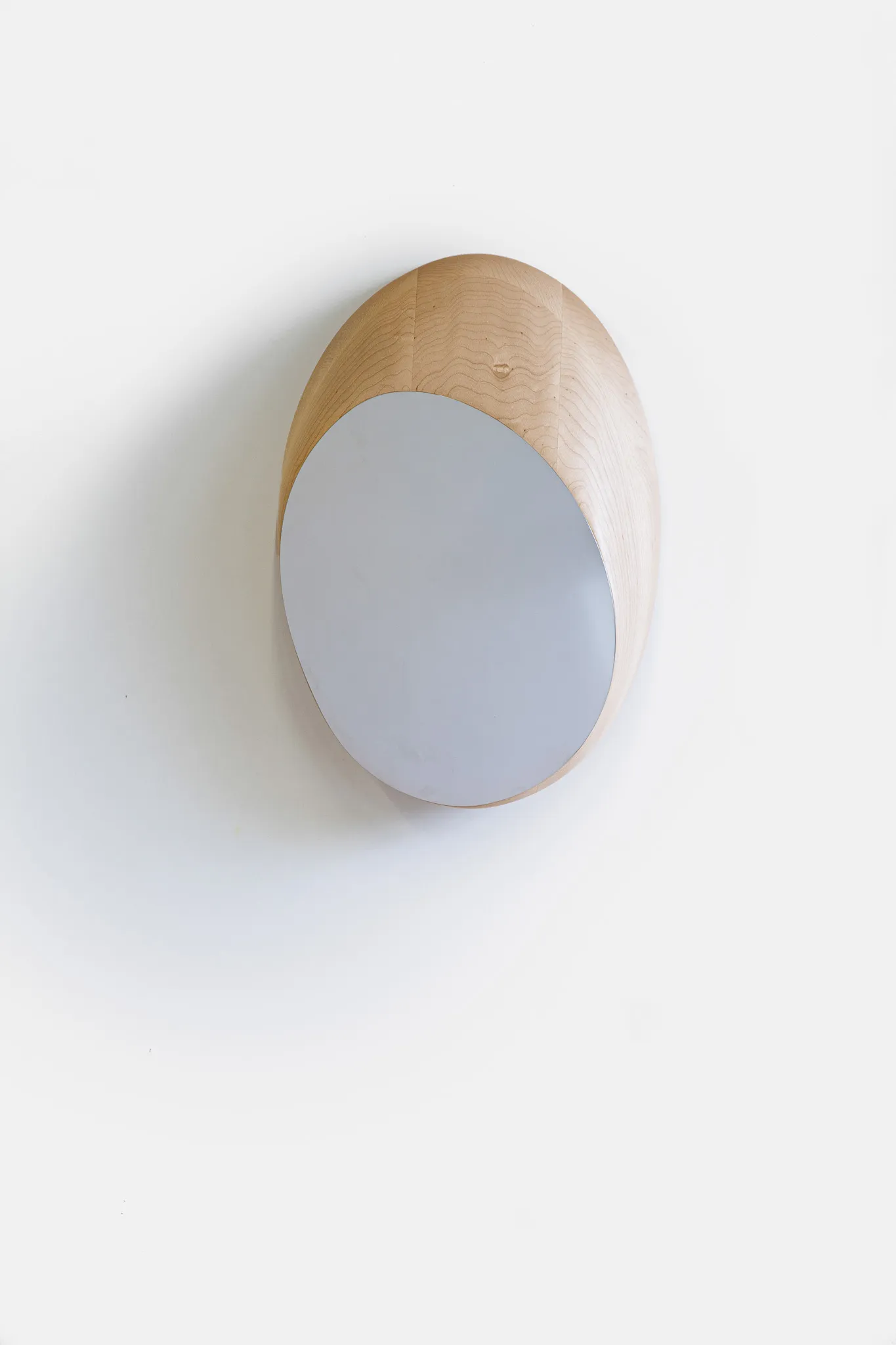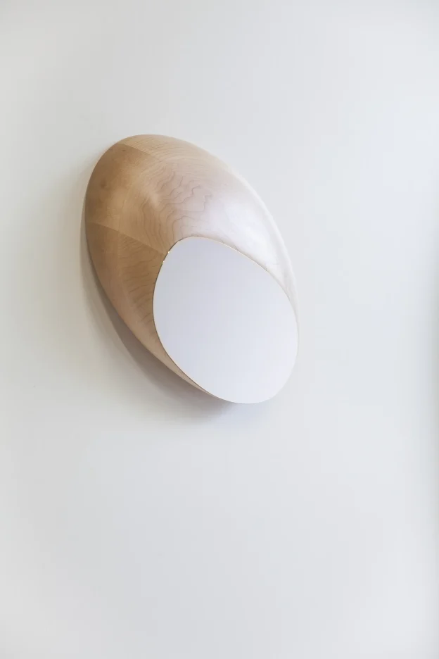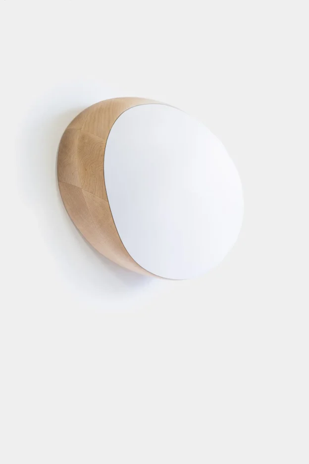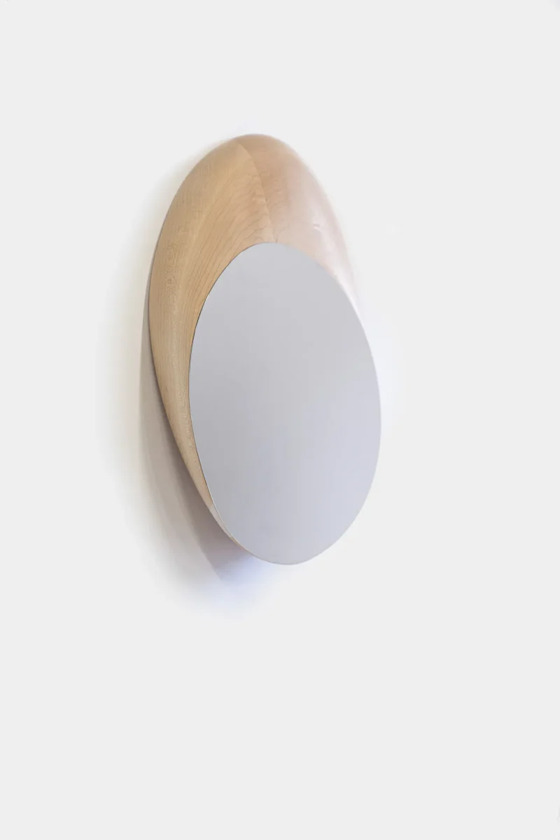 Very even stillness (medium) is a series of wall-mounted sculptures made from wood and mirror-finished steel. Due to their larger size, the objects can function as wall mirrors in a variety of contexts. They may appear individually or as compositions of multiple elements. In each piece, the steel mirror panel is positioned at a different angle, creating an illusion of space and blurring the boundary between the transcendental and the real.
