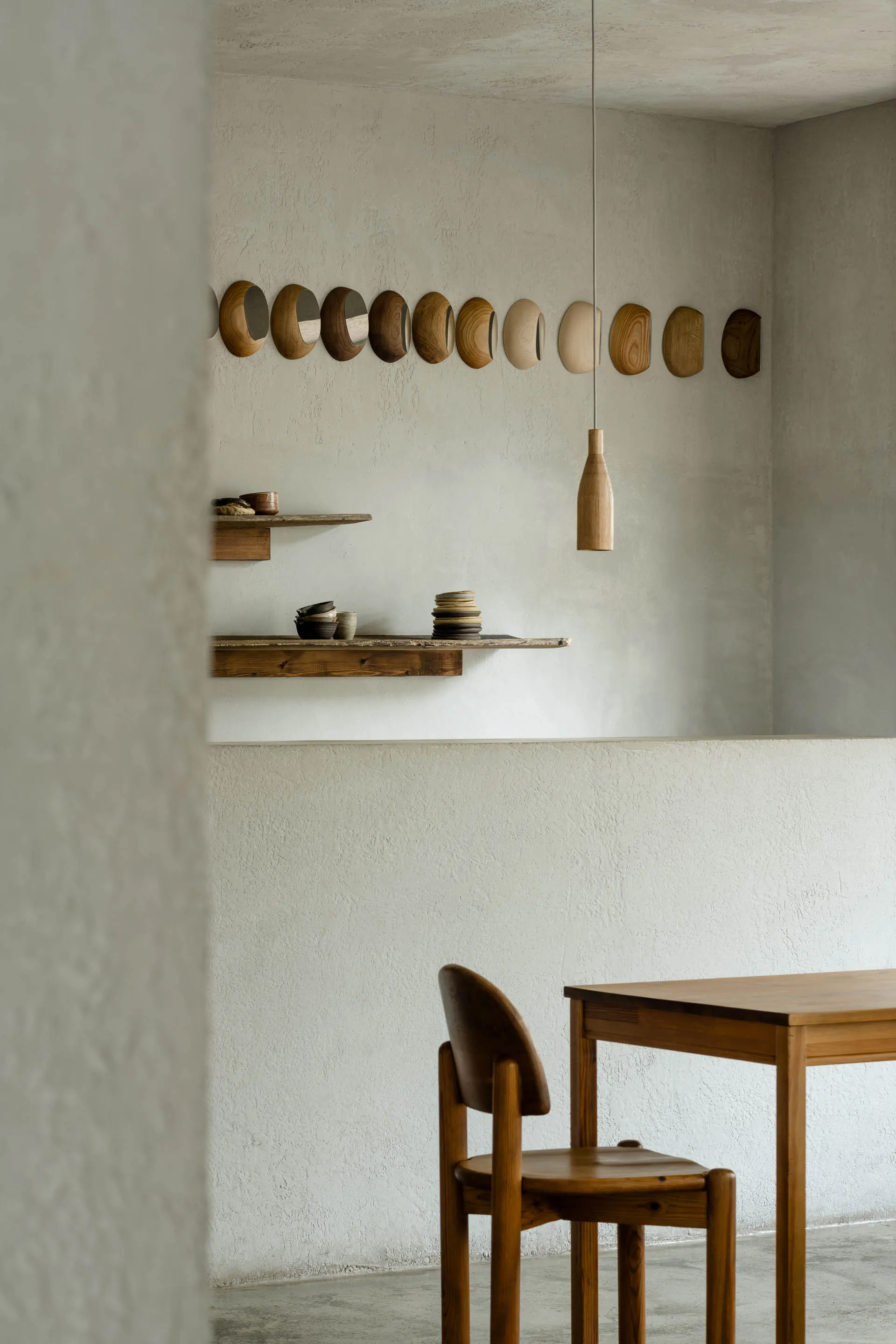 The result is a collection of eight series of objects crafted from various woods, including oak, maple, birch, beech, American walnut, red oak, elm, and Canadian maple. Each series contains seven shape variations that together can be associated with the phases of the moon moving across the sky. They are finished using distinct techniques. One series is hand-carved and coated with ink and black wax; another is stained in multiple colors and sealed with linseed oil or hard-oil wax; a third is hand-painted with dyes in different hues. The remaining five series are treated with oil or wax to emphasize the natural wood grain. Each form can be wall-mounted in six different orientations using a specially designed hanger.