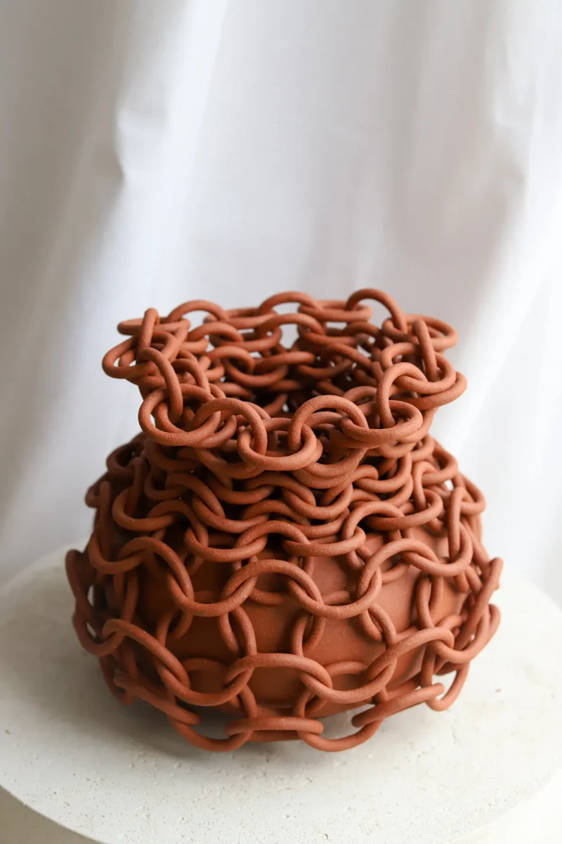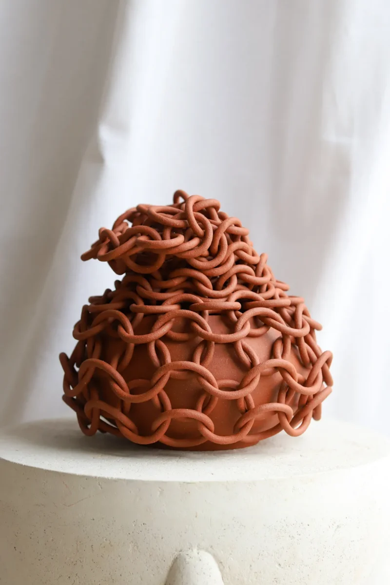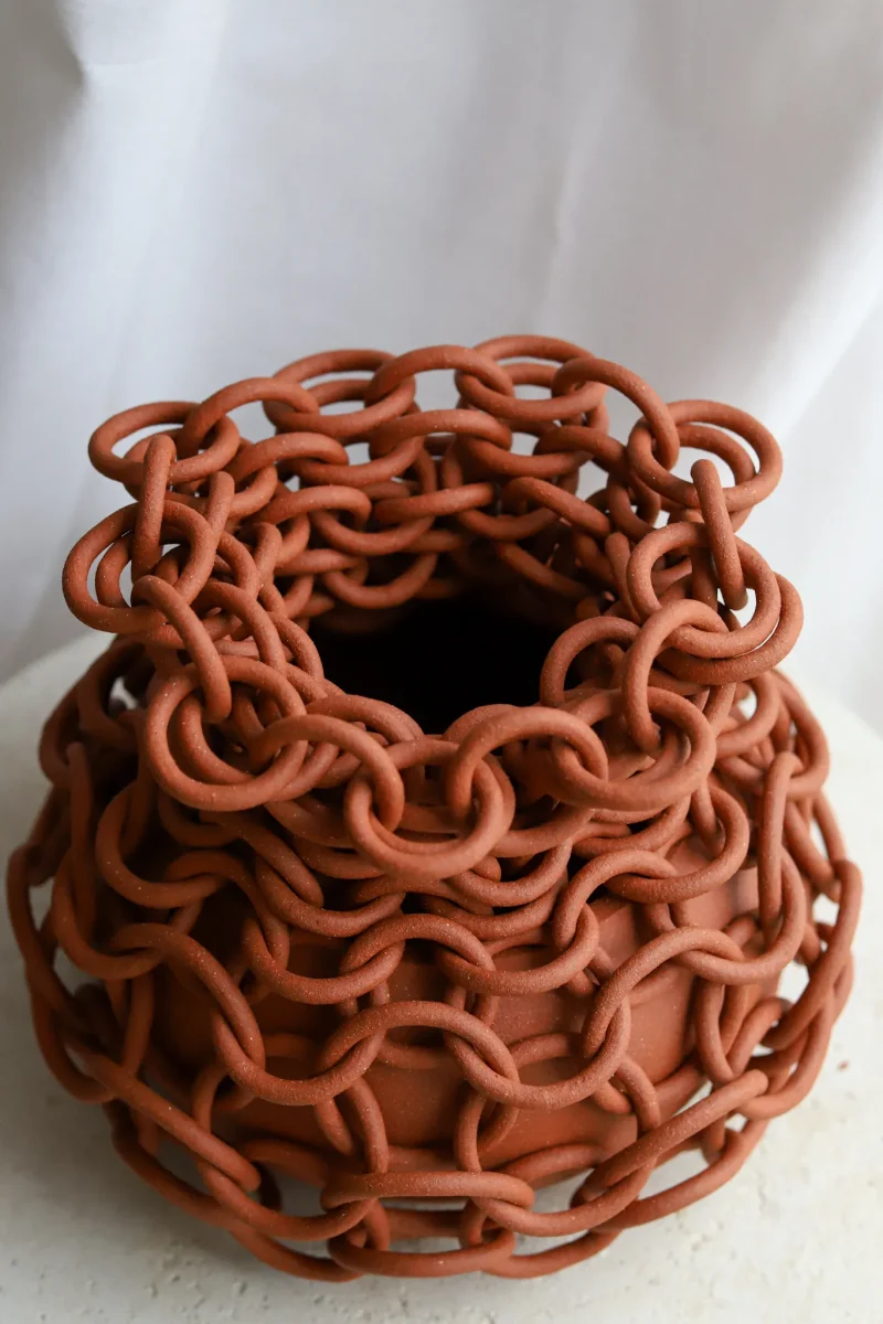 All of her vessels are hand-thrown, the chains and chainmail are hand-sculpted, and the pine needle is woven by hand. While creating, she works with the clay to bring out the organic curves and bends of each piece. She then adorns each piece with chains, chainmail, and/or pine needle. While chains and chainmail usually have a restricting nature, it creates interactive mobility with her pieces. The surface expressions, colors, and textures come together to create a valiantly organic and uniquely spirited form.
