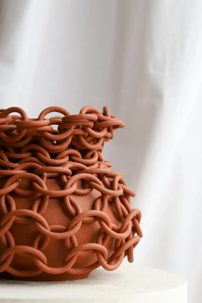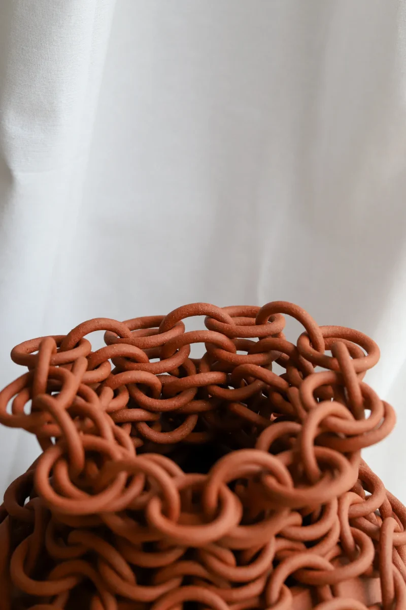 Inspired by the natural and ancient elements of our world, her vessels incorporate free flowing curves and shapes while also combining that with the precision and restrictions of chains. Displaying a juxtaposition of unique and refreshing contrasted with the feeling of being unearthed and lost in time; her vessels are intended to connect with a sense of familiarity to who we are.