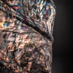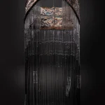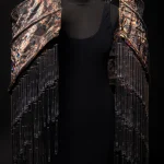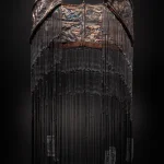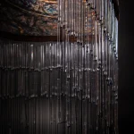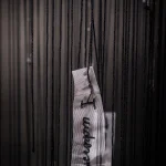 covered with the steel fabric. The fringe is made of 170 cotton blu threads and 400 empty Bic pens. The threads, that resemble ink, write phrases at the bottom of the fringe.