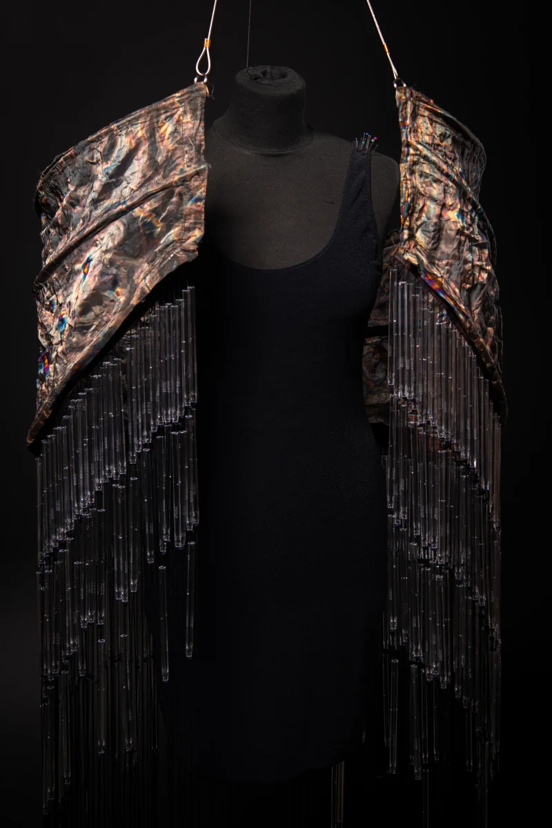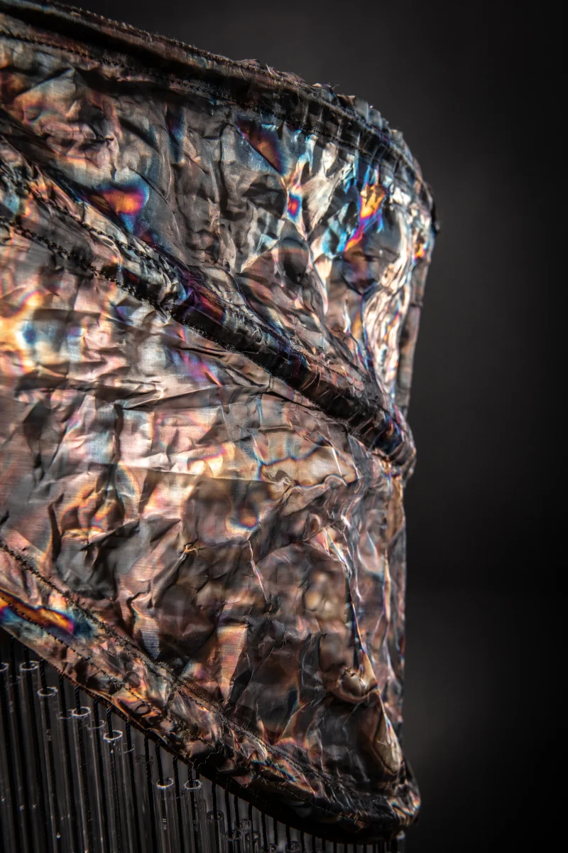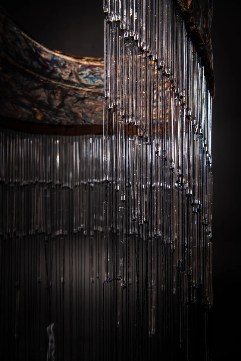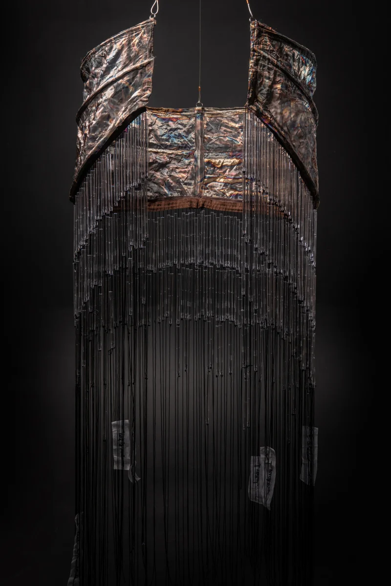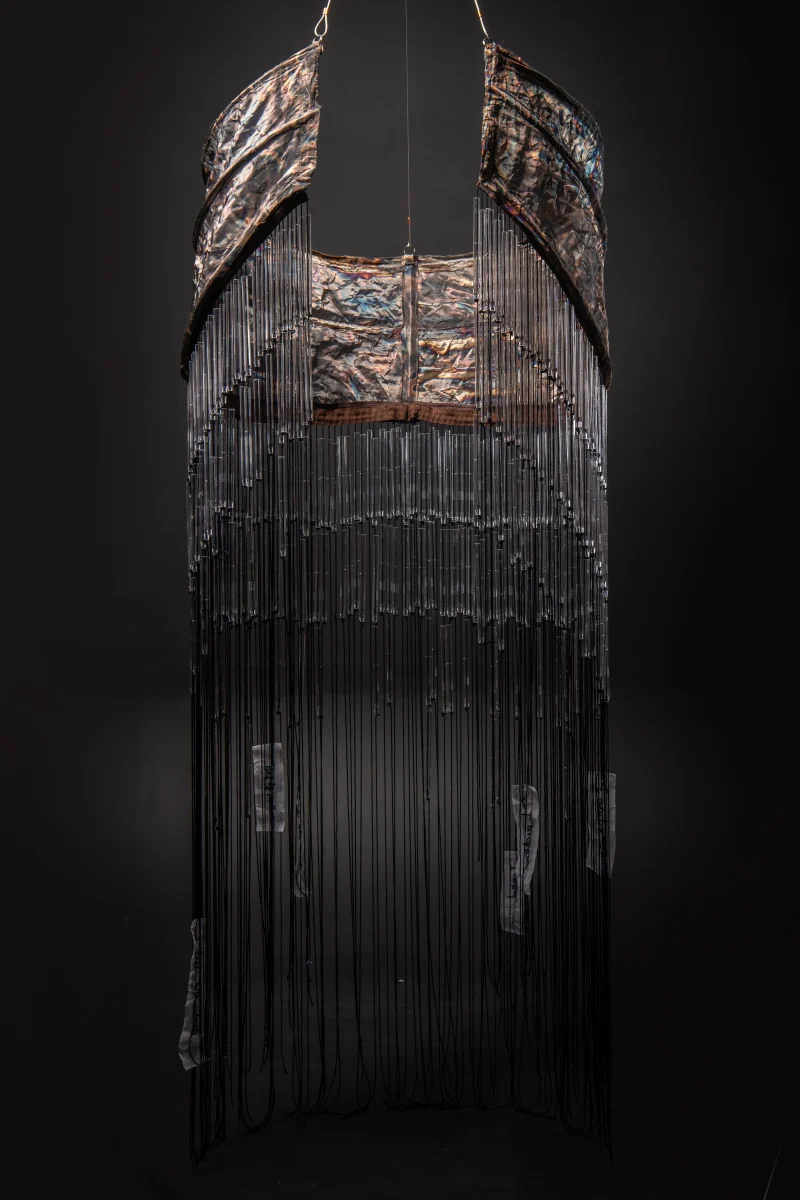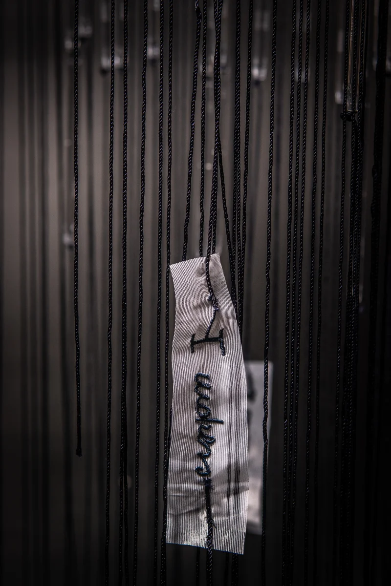 covered with the steel fabric. The fringe is made of 170 cotton blu threads and 400 empty Bic pens. The threads, that resemble ink, write phrases at the bottom of the fringe.