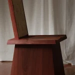 It is detailed by an angular boxed base that protrudes from the ground, a soft seat moulding, and a slanted back rest which holds a knitted inlay (by 2am close) – an ode to classical furniture features.