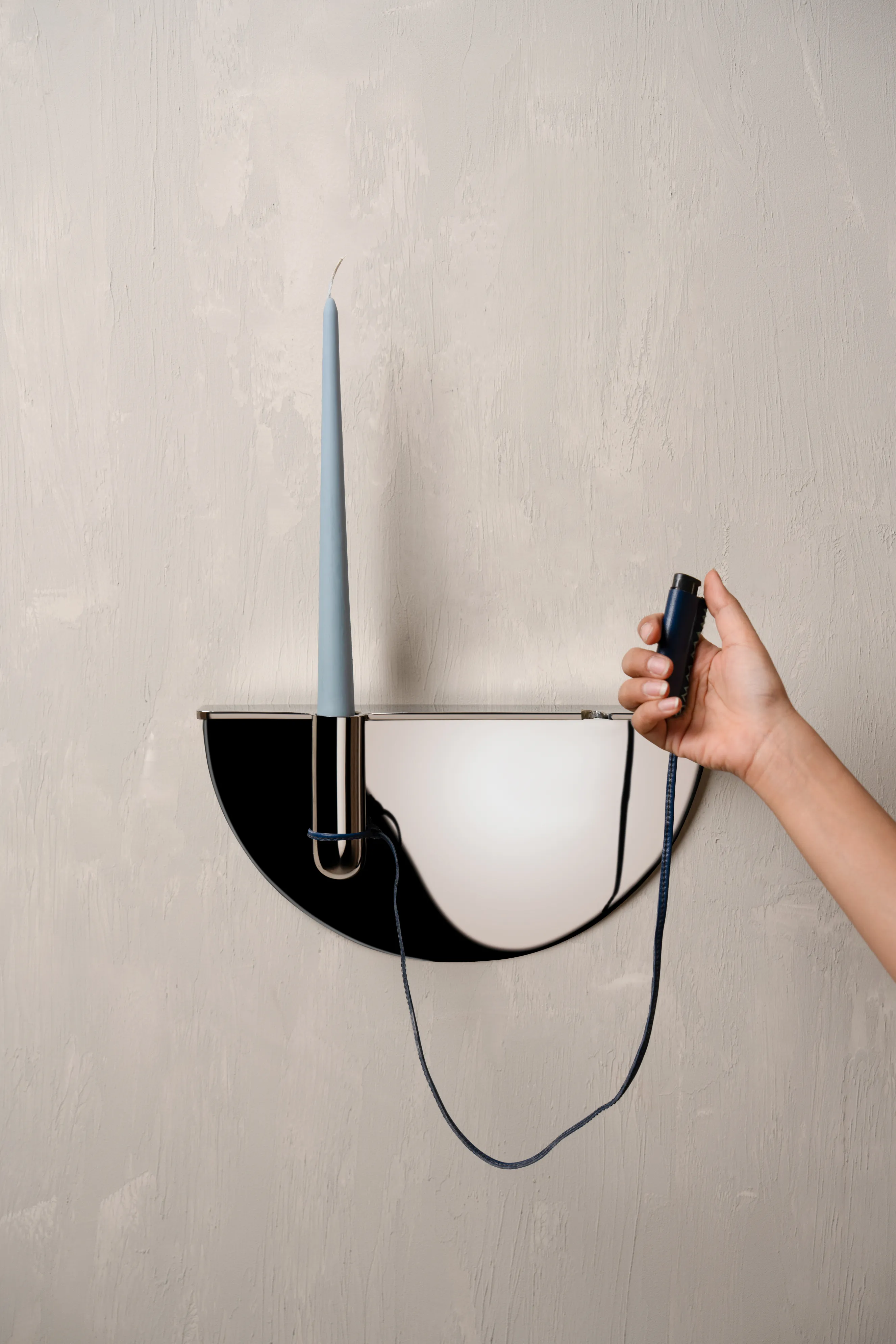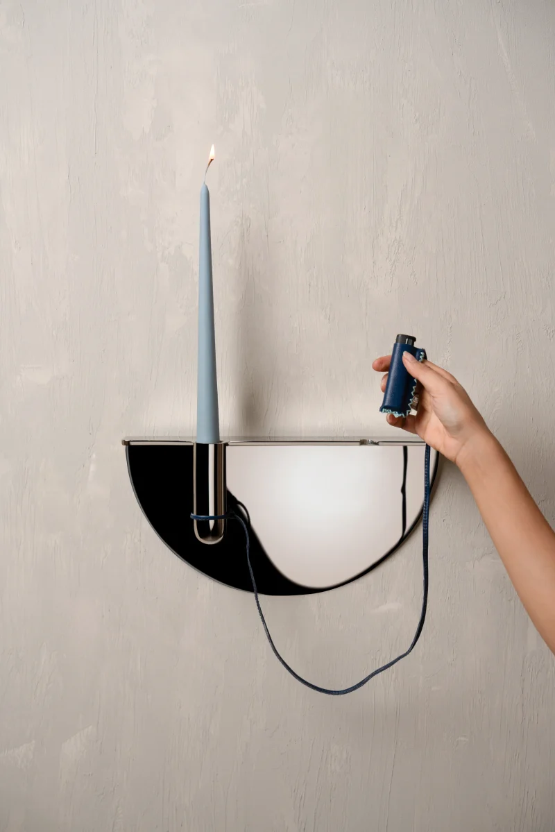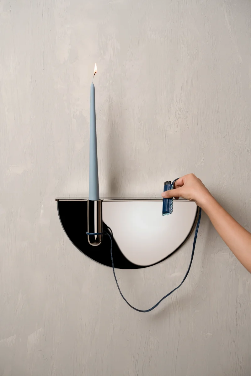Drawing from familiar Indian street and office scenes – pens tied with string in government offices or lighters hanging in local smoke shops – this wall-mounted candle holder is an ode to everyday ingenuity. Crafted in stainless steel, it elevates a utilitarian gesture into a thoughtful, sculptural form, holding a candle delicately in place while evoking nostalgia and quiet charm.
