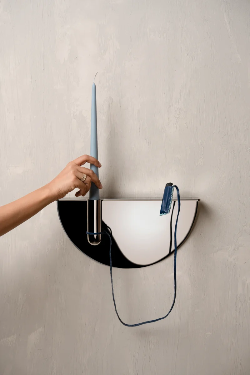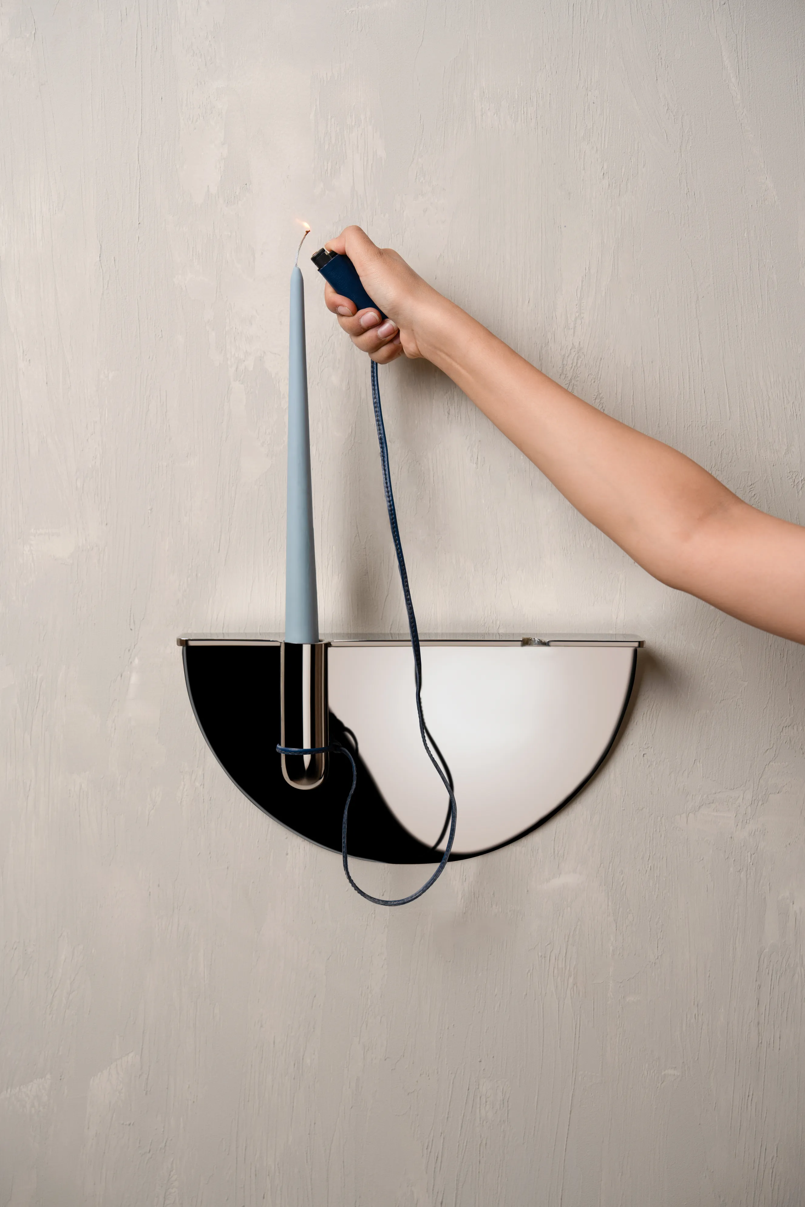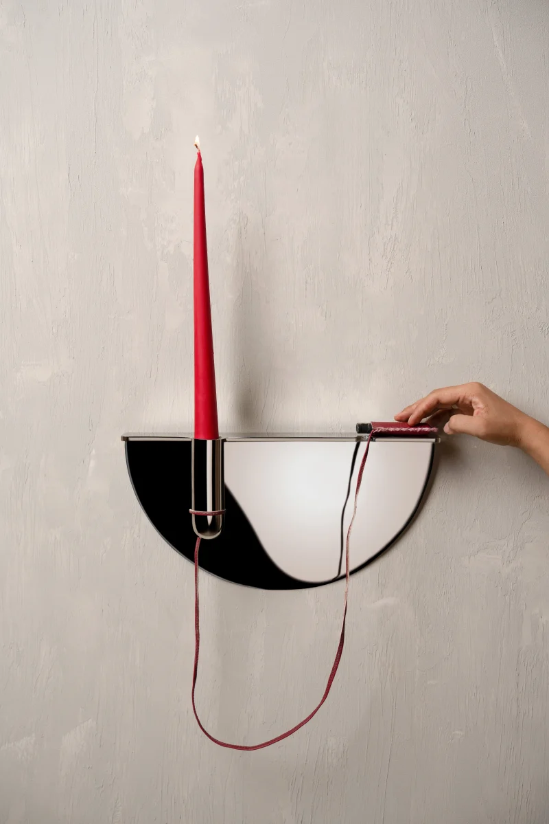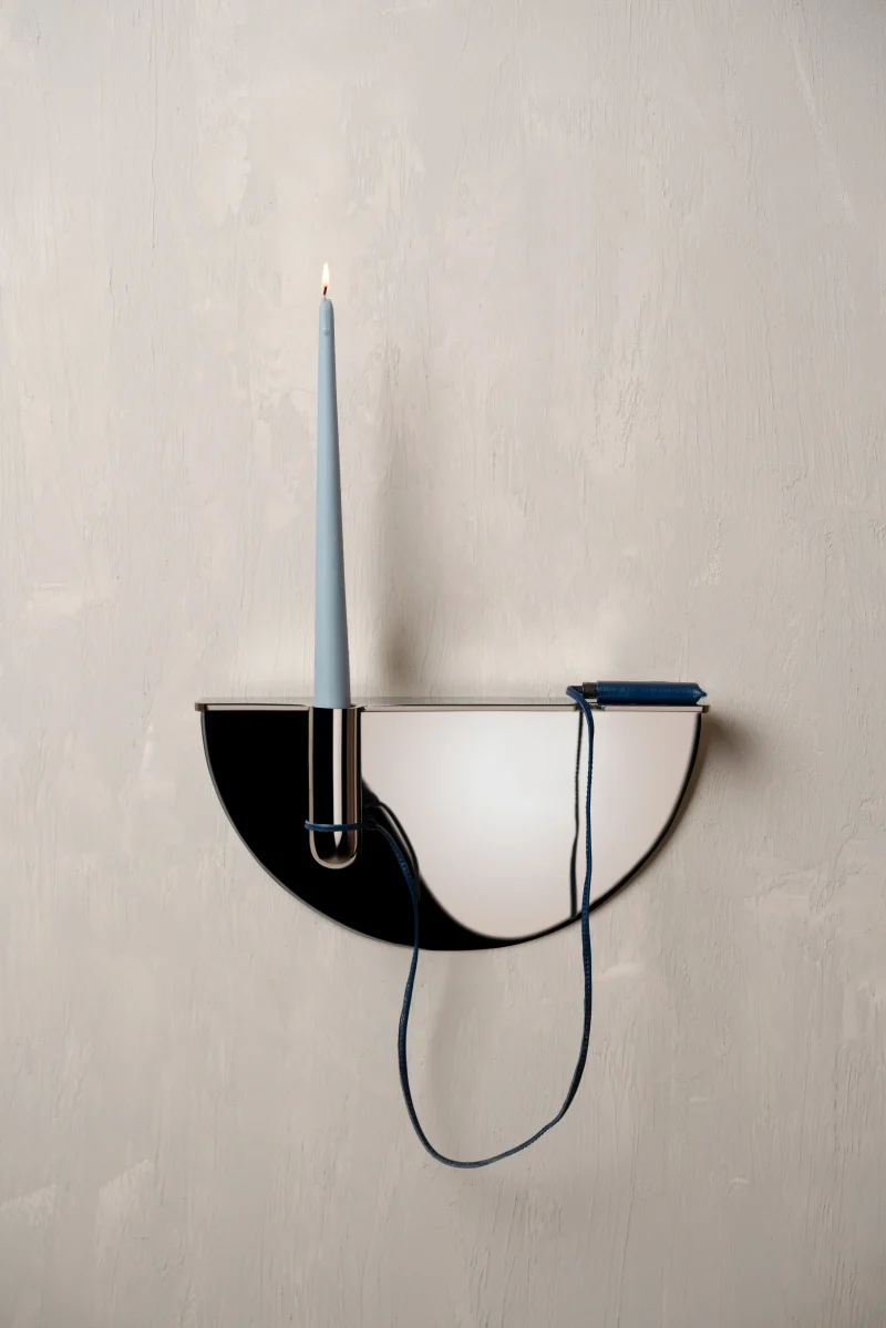 Drawing from familiar Indian street and office scenes – pens tied with string in government offices or lighters hanging in local smoke shops – this wall-mounted candle holder is an ode to everyday ingenuity. Crafted in stainless steel, it elevates a utilitarian gesture into a thoughtful, sculptural form, holding a candle delicately in place while evoking nostalgia and quiet charm.