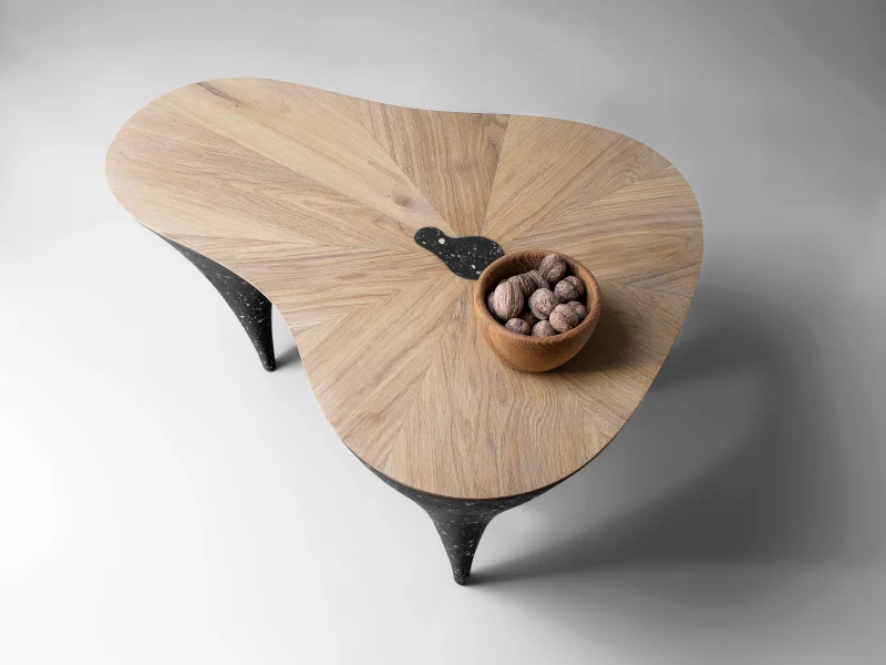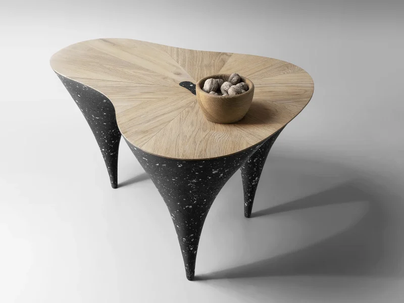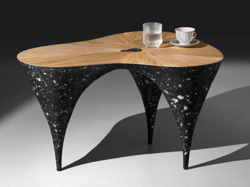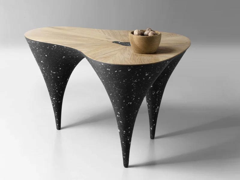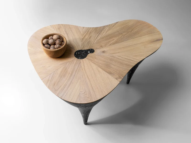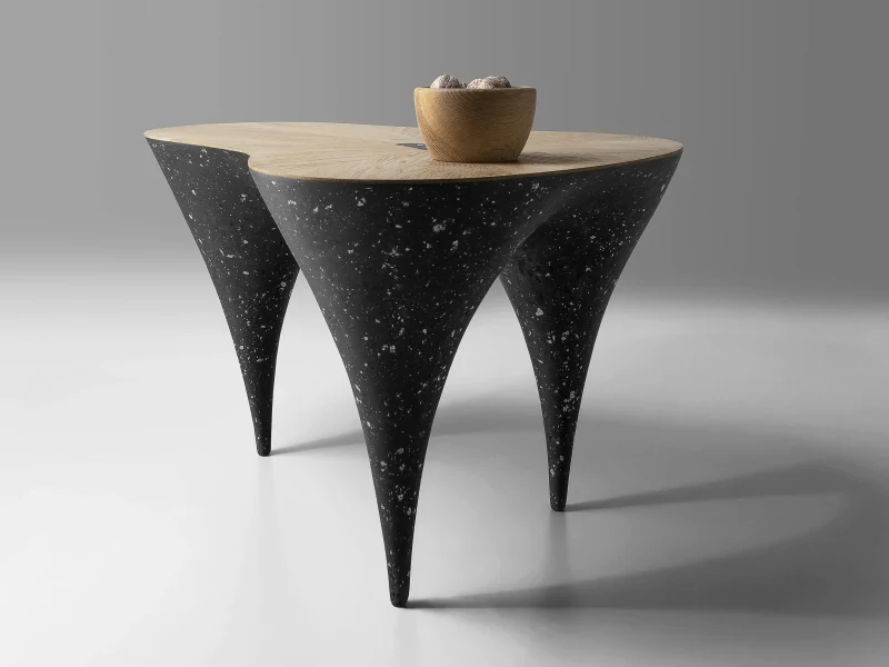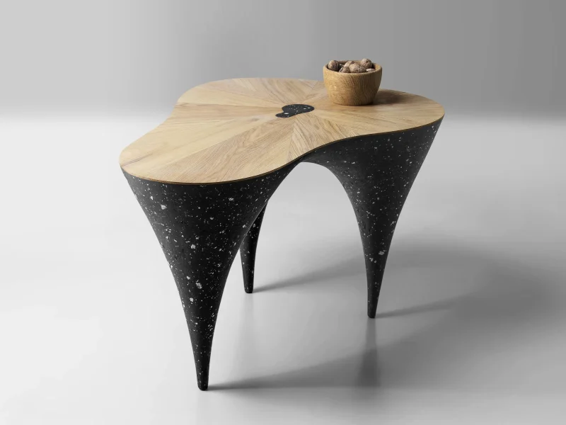 The tabletop is made of natural oak, and the base of the table, resembling concrete in appearance, is made by pouring solid mass, which is closer to wood in its properties. The set task was technologically challenging – it was necessary to fuse wet mass and moisture-sensitive wood. The entire structure of the table is manufactured at the same time, so that the two materials join together smoothly and precisely to avoid any gaps. After the product dries, it is scrubbed, and the tabletop is oiled.