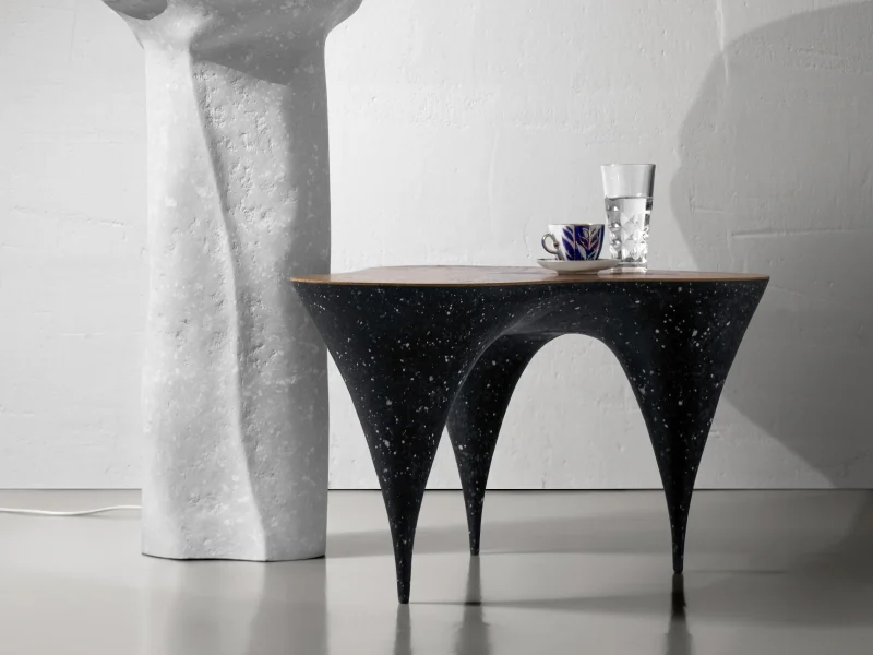 The black concrete-like material is the result of various experiments. It is a mixture of several components: the largest part being paper pulp. Although paper is often associated with fragility, when mixed with other materials and dried it becomes as strong as wood, it resembles concrete but is slightly elastic, so it does not split or crumble.