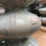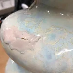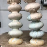 The glaze-work has an incredible depth of color and texture, that will range from pink porcelain in a crawling effect, merging together with a crystal mint-green which will expand towards its bottom, then to a sandy color and effect. The combination of these techniques and glazes is achieved through layering during the different stages of clay processes and kiln firings.