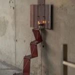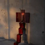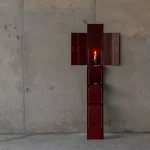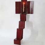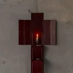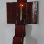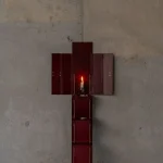 A candle holder rendered in blood red steel is mounted onto the wall as an altar panel painting that folds closed to simulate a medical cabinet. The candle supported by the metal structure is pierced by nails at different heights marking time intervals in a contemporary rendition of the ancient candle alarm clock. Deliberately syncretic, the object references themes of ancient ritual and religious practices while addressing modernist values of asepsis. As the candle shortens the melting wax releases the nails onto the cabinet’s metal plate which drop with loud “clings”. This moment marks a sudden fractionalization of an otherwise fluid condition of time. A suspension of a state of temporal leisure into that of pragmatic count; palpably evidencing differences between Henry Bergson’s concepts of “objective time”: the time of watches, timetables, calendars, with that of “duration” (la durée); lived time, time felt and acted measured by subjective experience.