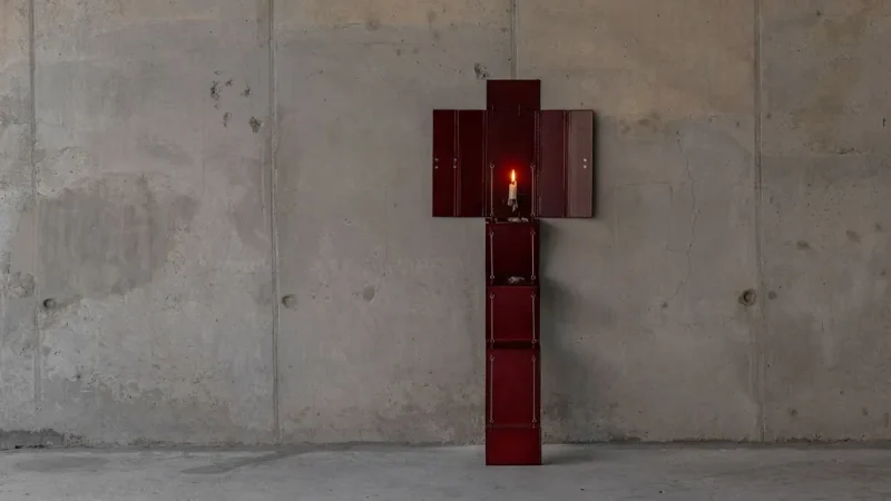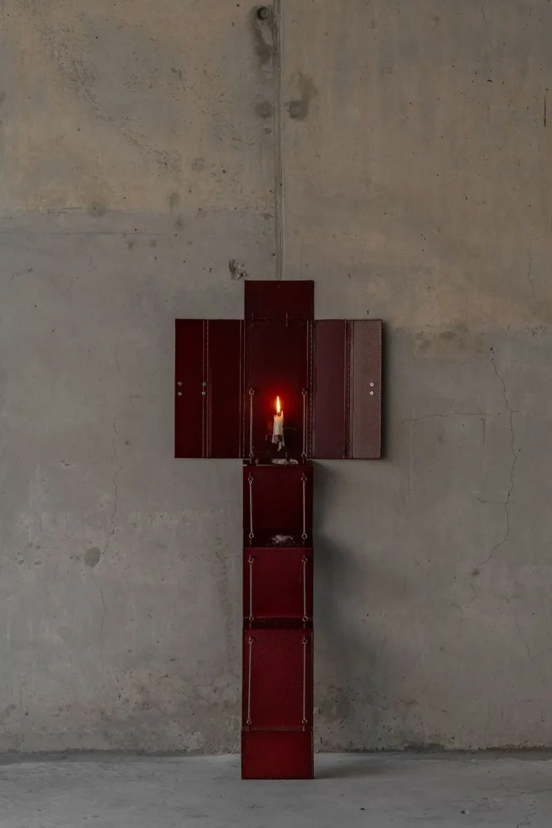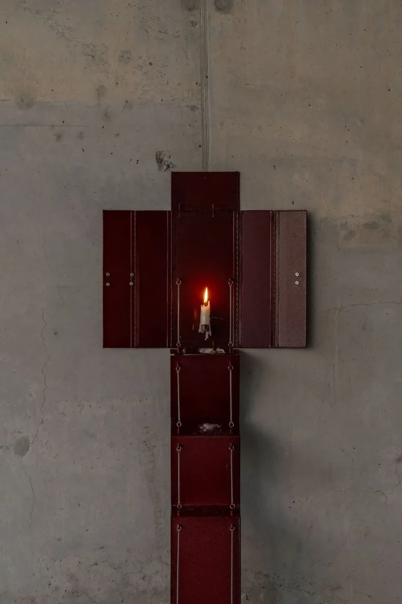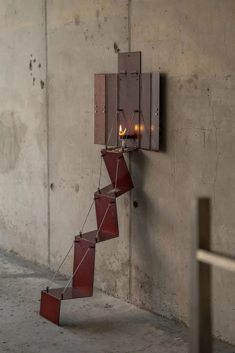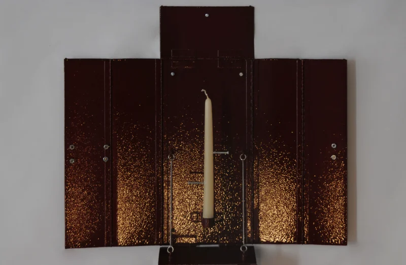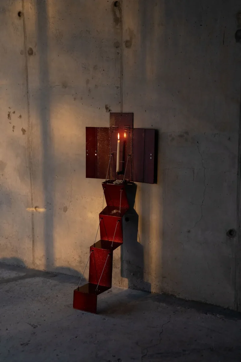 A candle holder rendered in blood red steel is mounted onto the wall as an altar panel painting that folds closed to simulate a medical cabinet. The candle supported by the metal structure is pierced by nails at different heights marking time intervals in a contemporary rendition of the ancient candle alarm clock. Deliberately syncretic, the object references themes of ancient ritual and religious practices while addressing modernist values of asepsis. As the candle shortens the melting wax releases the nails onto the cabinet’s metal plate which drop with loud “clings”. This moment marks a sudden fractionalization of an otherwise fluid condition of time. A suspension of a state of temporal leisure into that of pragmatic count; palpably evidencing differences between Henry Bergson’s concepts of “objective time”: the time of watches, timetables, calendars, with that of “duration” (la durée); lived time, time felt and acted measured by subjective experience.