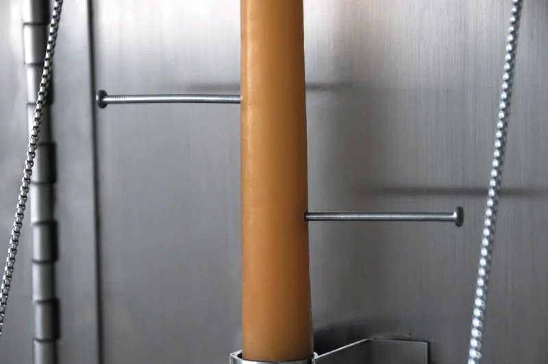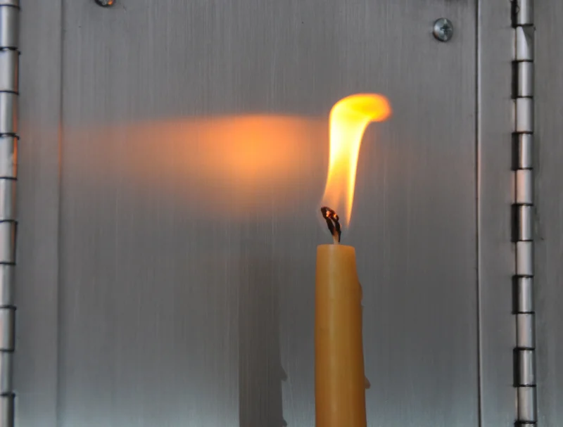 A candle holder rendered in stainless steel is mounted onto the wall as an altar panel painting that folds closed to simulate a medical cabinet. The candle supported by the metal structure is pierced by nails at different heights marking time intervals in a contemporary rendition of the ancient candle alarm clock. Deliberately syncretic, the object references themes of ancient ritual and religious practices while addressing modernist values of asepsis. As the candle shortens the melting wax releases the nails onto the cabinet’s metal plate which drop with loud “clings”. This moment marks a sudden fractionalization of an otherwise fluid condition of time. A suspension of a state of temporal leisure into that of pragmatic count; palpably evidencing differences between Henry Bergson’s concepts of “objective time”: the time of watches, timetables, calendars, with that of “duration” (la durée); lived time, time felt and acted measured by subjective experience.