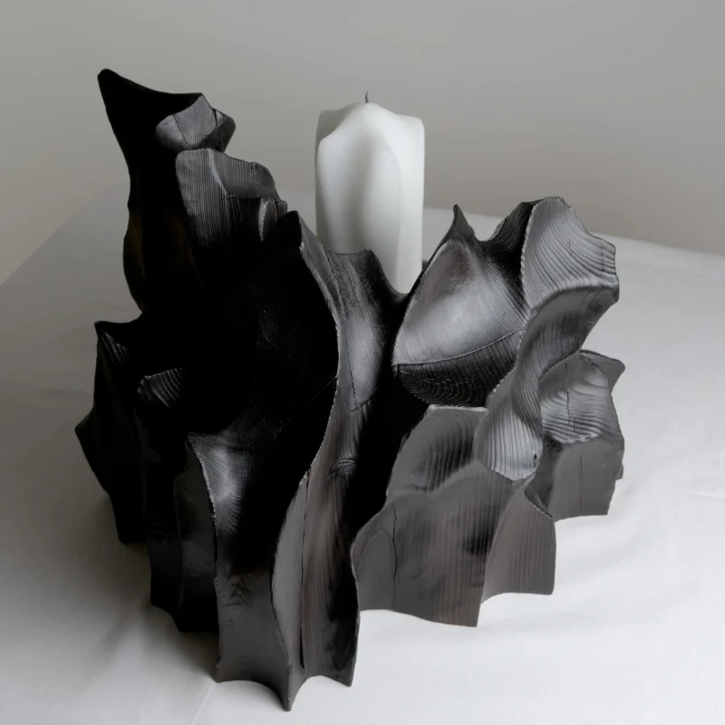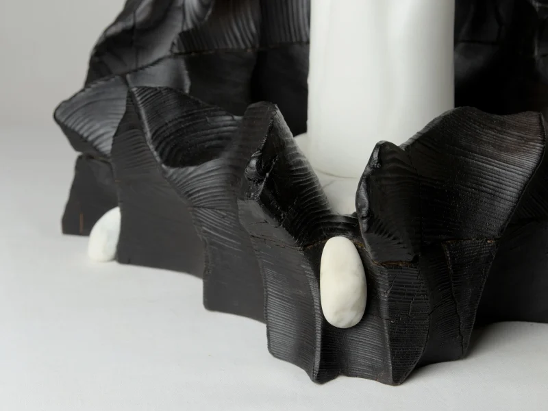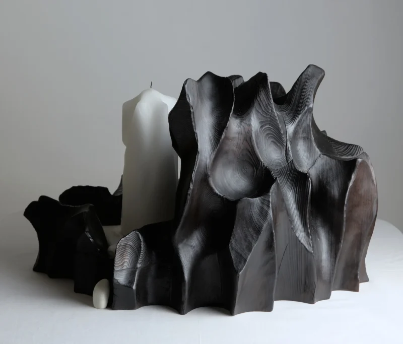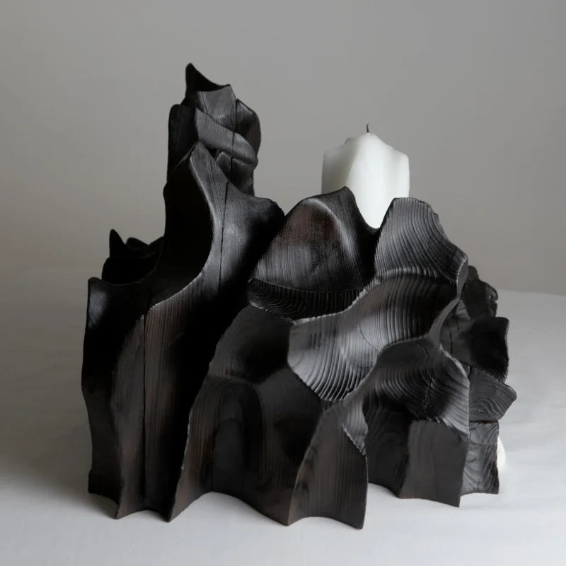 Hand carved from repurposed pine wood and remnants of white marble. The pine is enhanced using the traditional Japanese Yakisugi method transforming and enhancing the material, and it’s then elegantly finished with natural oils and sealed with beeswax. Beneath, a subtle cork lining ensures your surfaces remain pristine.