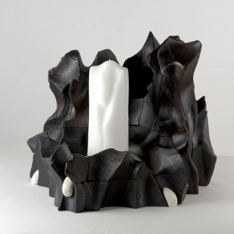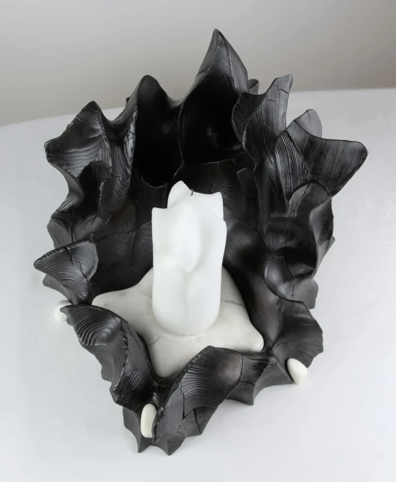 The melting marble presses into the organic shapes of the scorched wood, as wildly dancing flames rise like wild roses in the spring breeze.
