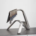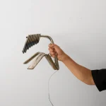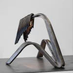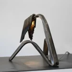 Leaning under unseen forces, this sculptural lamp holds itself at a delicate threshold. Its steel form mirrors a blossom at the edge of withering, the light within still breathing through a shade that drapes downward. In this moment, fragility and fortitude coexist, preserved in a single suspended gesture.