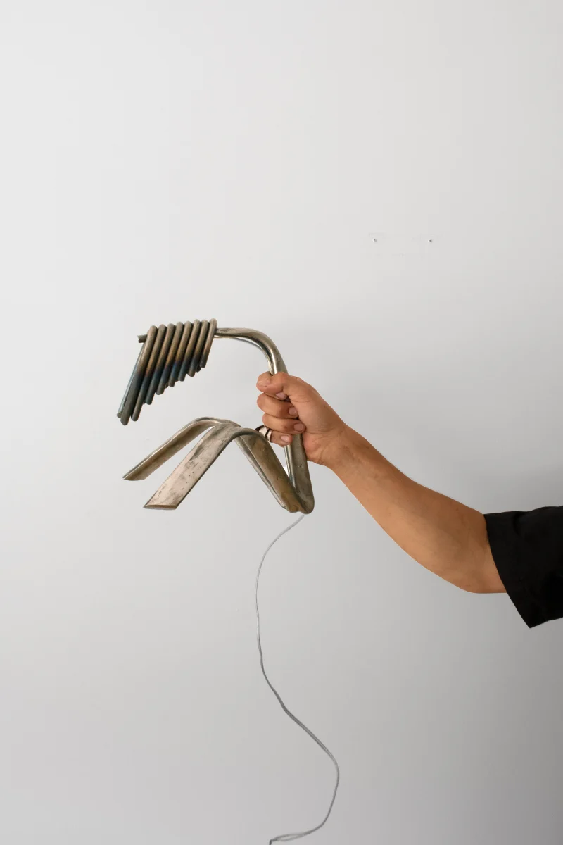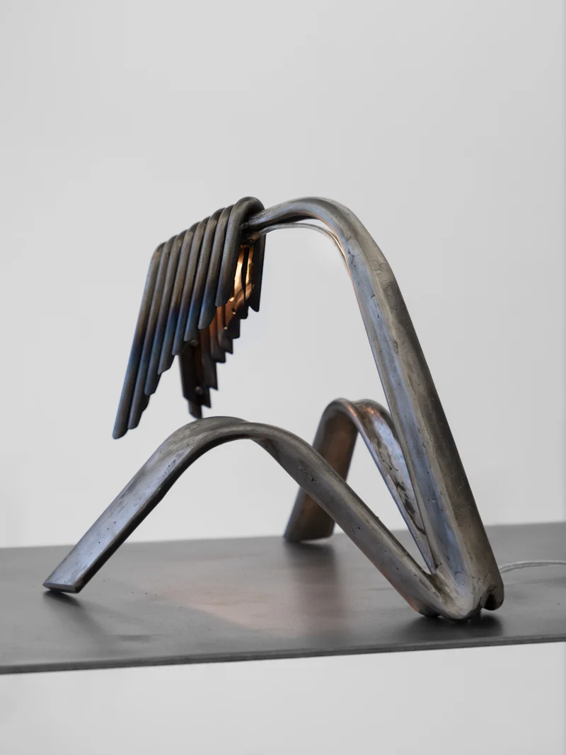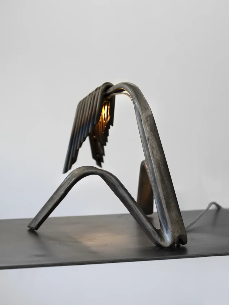 Leaning under unseen forces, this sculptural lamp holds itself at a delicate threshold. Its steel form mirrors a blossom at the edge of withering, the light within still breathing through a shade that drapes downward. In this moment, fragility and fortitude coexist, preserved in a single suspended gesture.